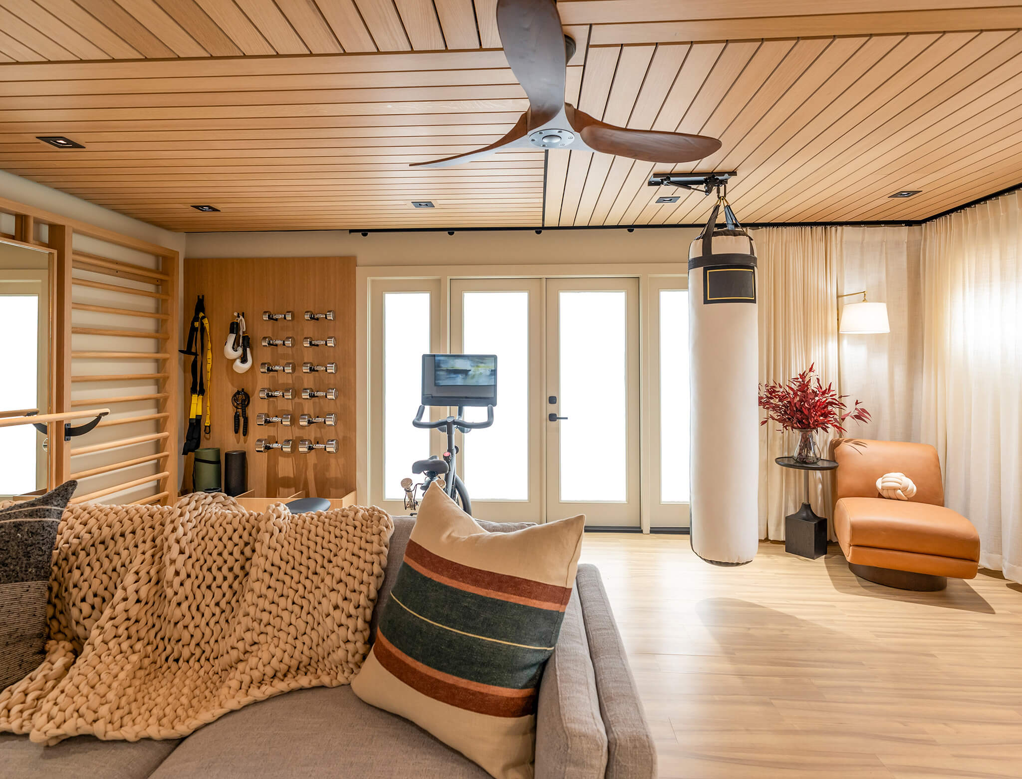 Sam can’t go to a regular gym because it can become very overwhelming for him. So Danny wanted to incorporate some at-home gym equipment for him to have a space to work out in comfort. They included a punching bag, a full rack of free weights, and an exercise bike, as well as a ballet barre for Maeve.