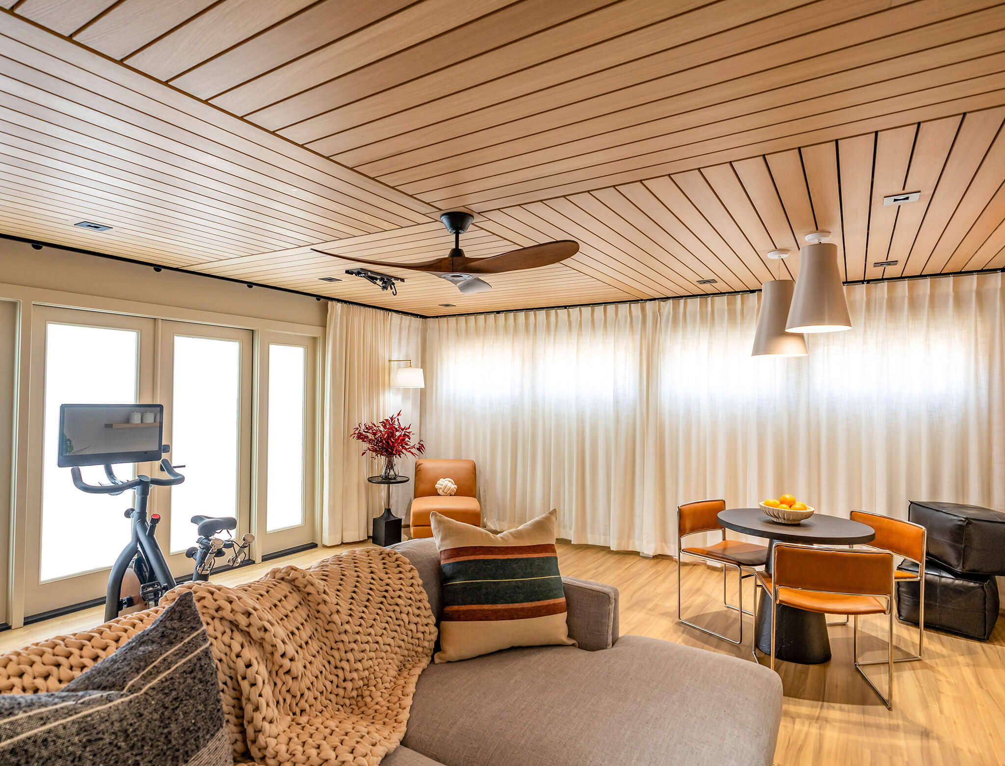 The neutral, earth-toned color palette they decided on wasn’t chosen just because it’s beautiful—but also because it’s calming. A grounded, serene color scheme will help Sam and Theo feel more relaxed in the space, while the architectural wood slat ceiling dampens sound and also helps visually separate the four different activity zones that they’ve created.