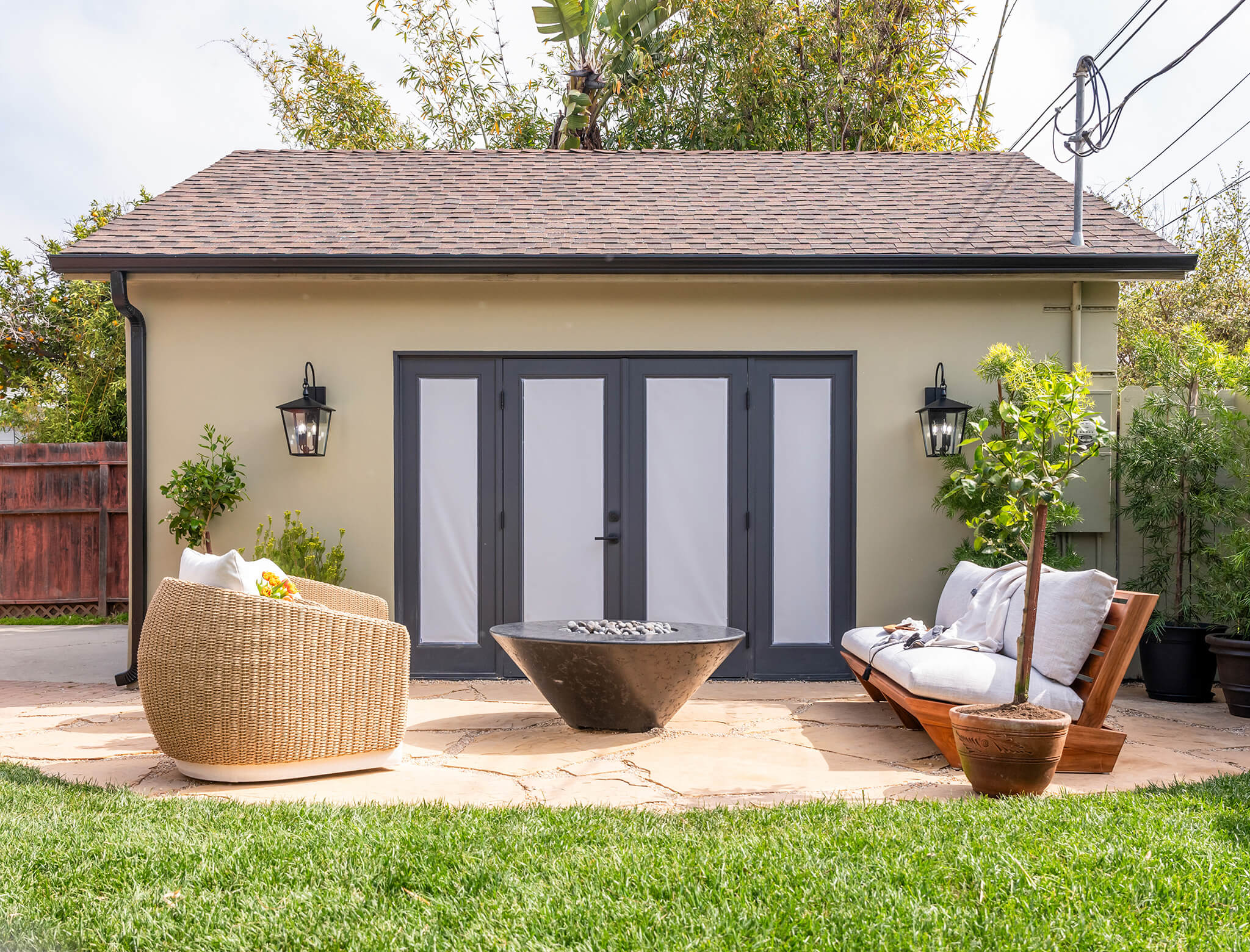 To create a special place specifically for Maeve, Drew, Jonathan, and Danny wanted to create a relaxing outdoor space for her to entertain or chill in the yard. They added french doors which open up right onto a flagstone patio, with plush seating for her and her guests and a modern fire table.
