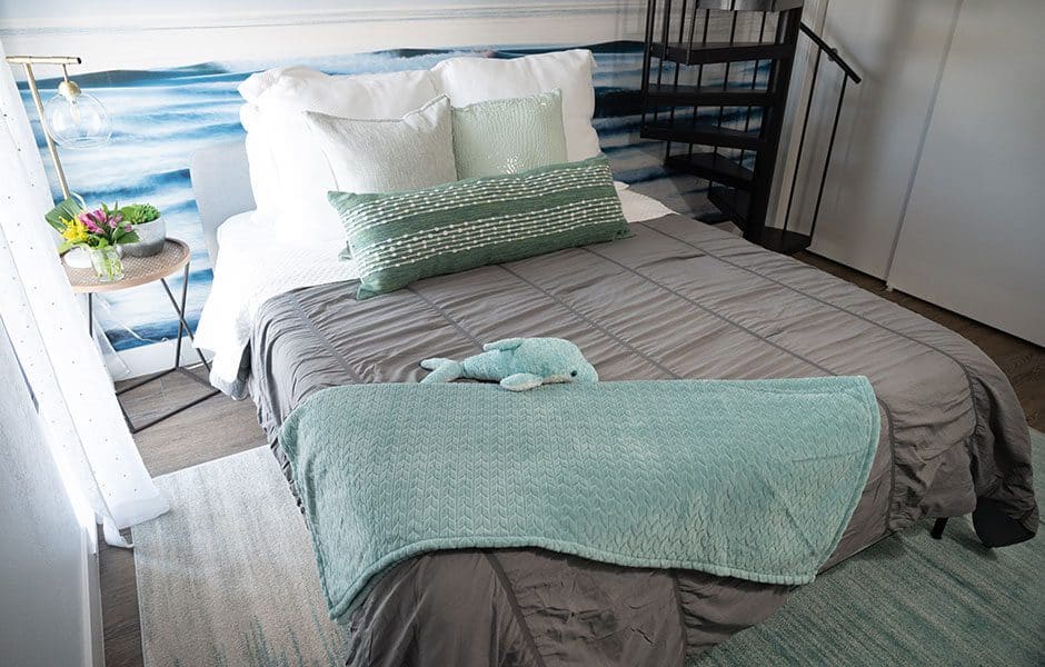 Christina mentioned in the inspiration our how much she liked a beach theme, which referred both to the color palette of her bedroom and the ocean photos she has taken over the years. We found a wall-length mural similar to her photography to install behind her bed, which we styled with a sea-green area rug and muted pastels. Now she can float away to sleep every night in her relaxing ocean hideaway.