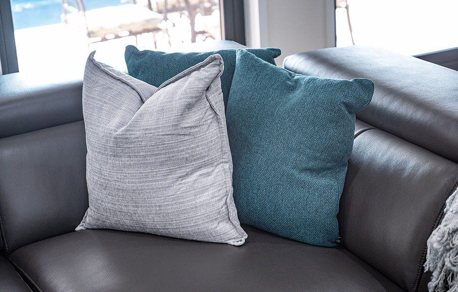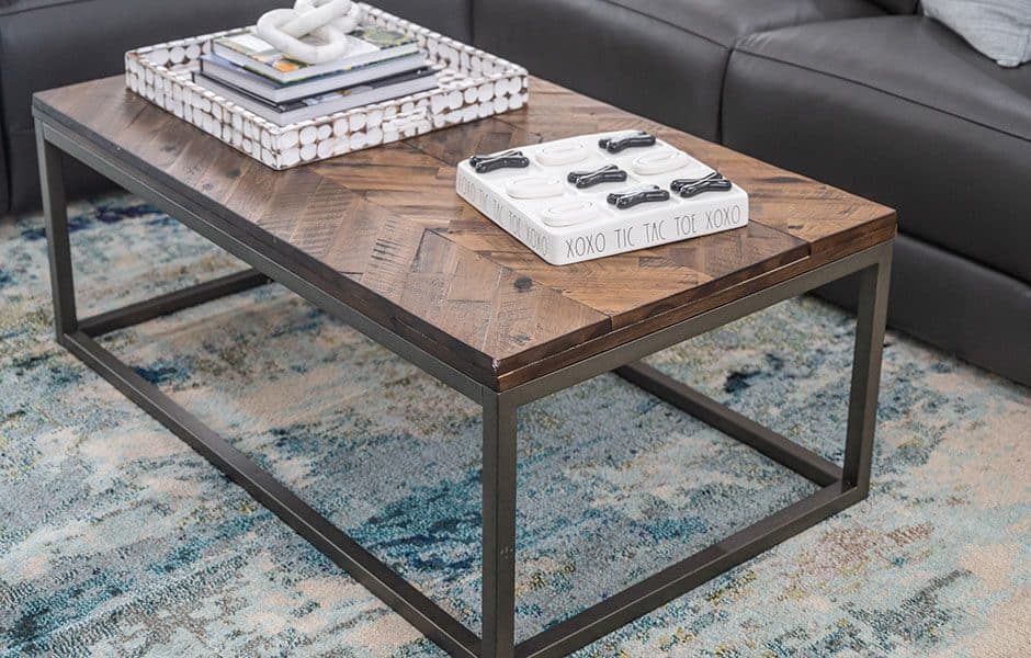 Debbie said she was opening to large lighting fixtures, so we took her at her word and installed a massive feature over her dining room table and chairs—well, chairs and bench. We figured that, with a large extended family, Debbie and Christina could use the extra seating a vintage bench would provide. Combined with the natural tones of the table and the nearby torched mantle, this velvet beauty perfectly balances the modern upgrades, with a subtle nod to the home’s past.