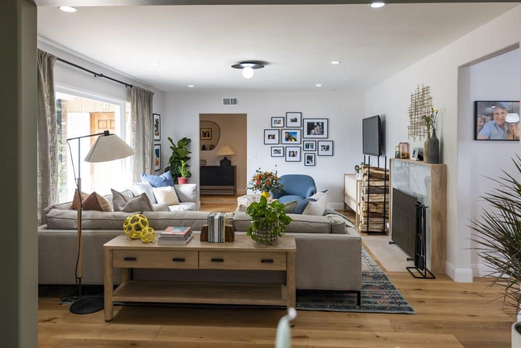 Before, the living room was full of Brendan’s many crafting tables, and great features like the fireplace were left by the wayside. We refaced the fireplace with beautiful wood accents and added light, stylish living room furniture so that it can become a welcoming place to host friends and family.
