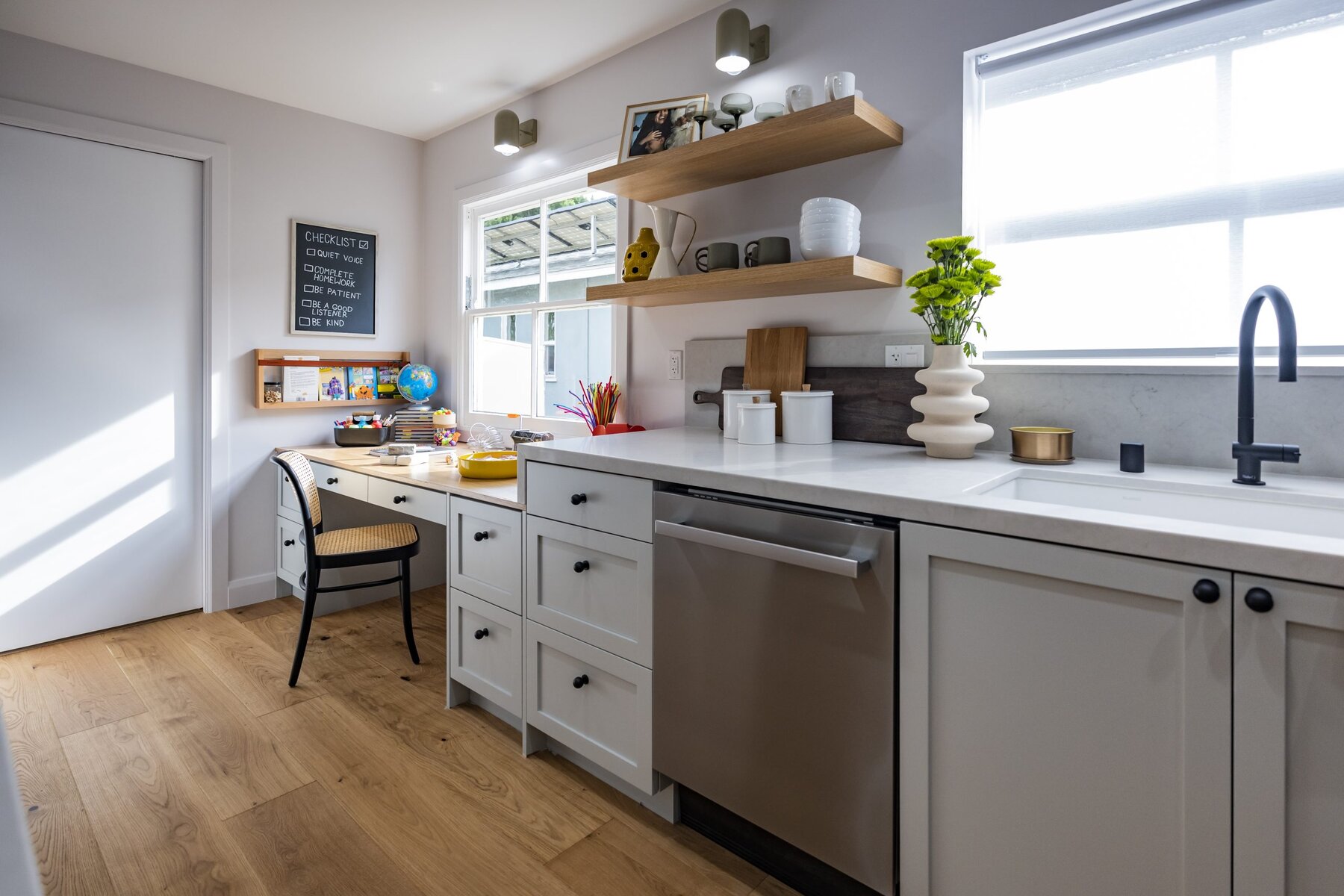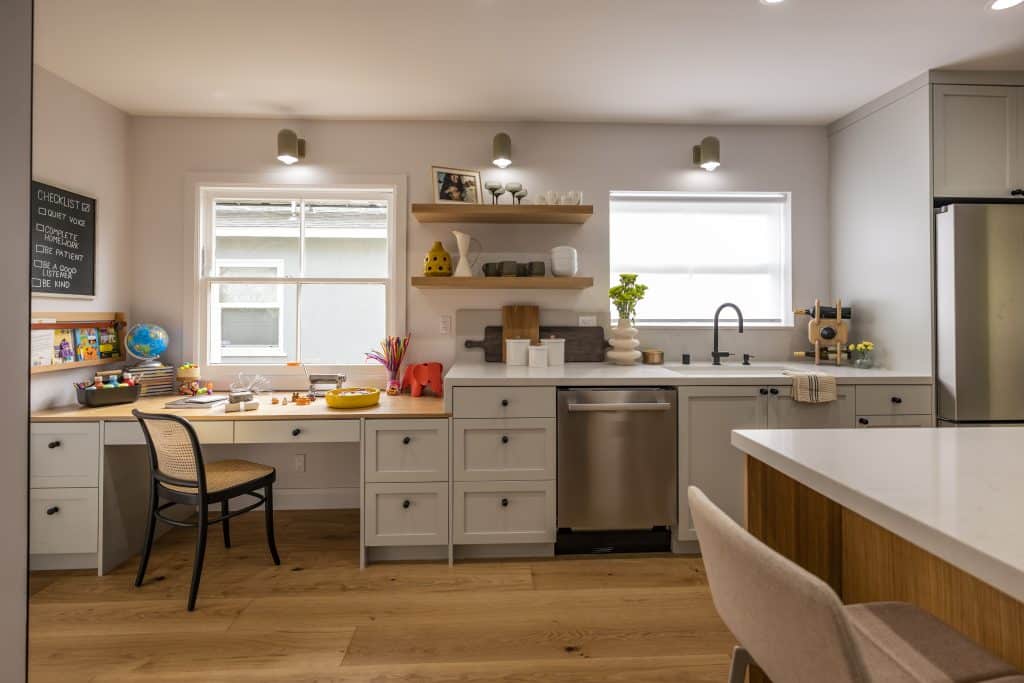 Not only were we able to open up the kitchen so that Jennifer and Paul can cook and chat with one another at the same time, but we even added a crafting corner where Brendan can express his creativity. Now there’s more than enough space for the entire family to hang out together.