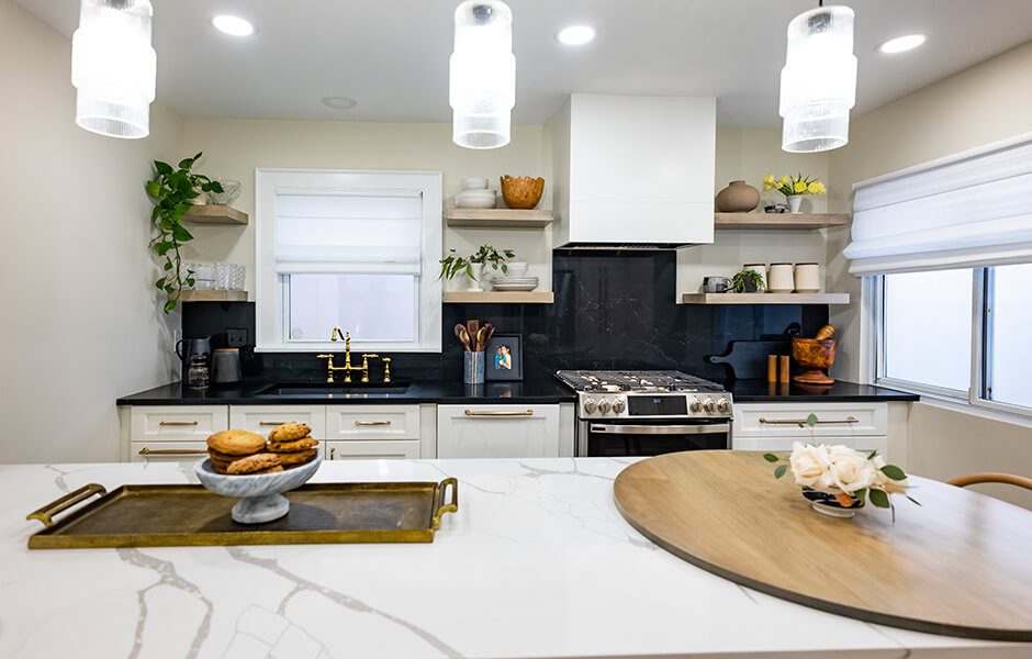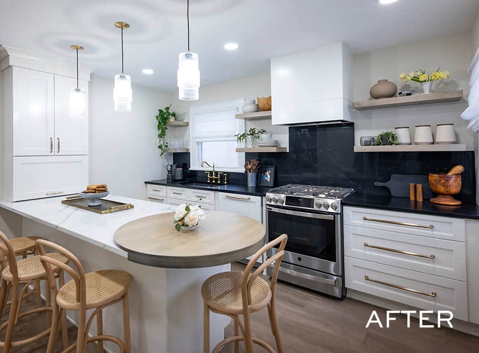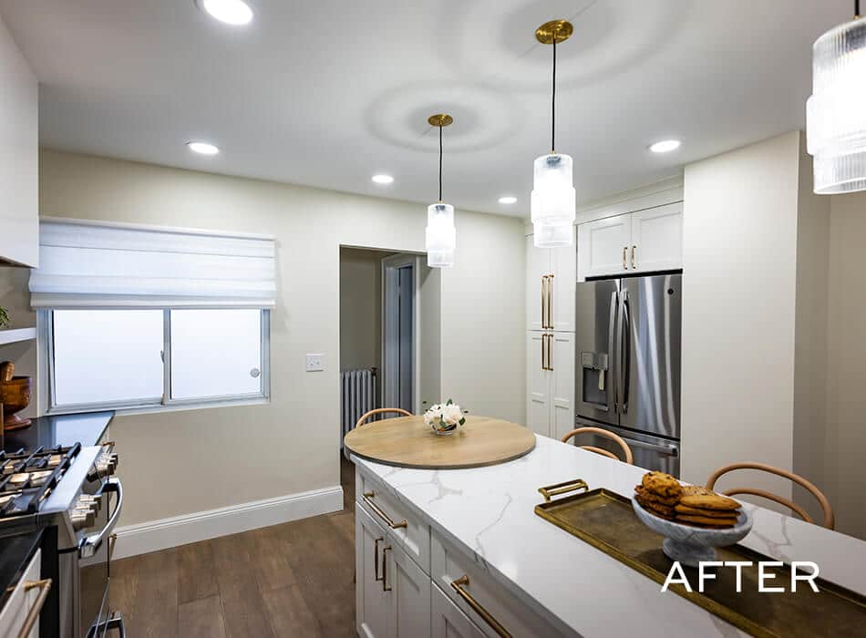 Even since Halle was a little girl, Yvonne’s kitchen has acted as a hub for family, friends, and students to gather around. So, to make her renewed “cookie talks” easier, we installed a peninsula with an attached wooden tabletop, so that her new prep space could double as an office space as well.