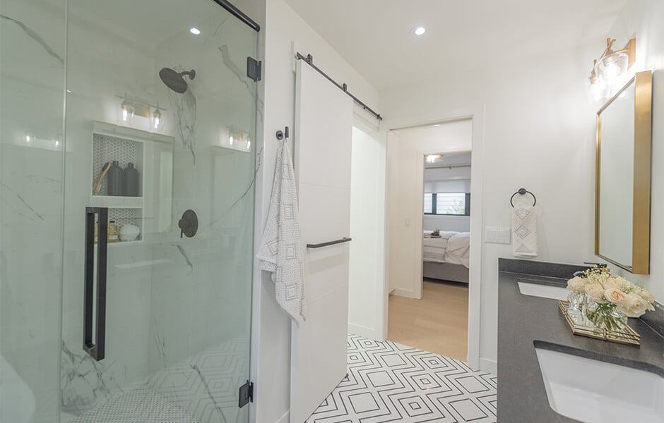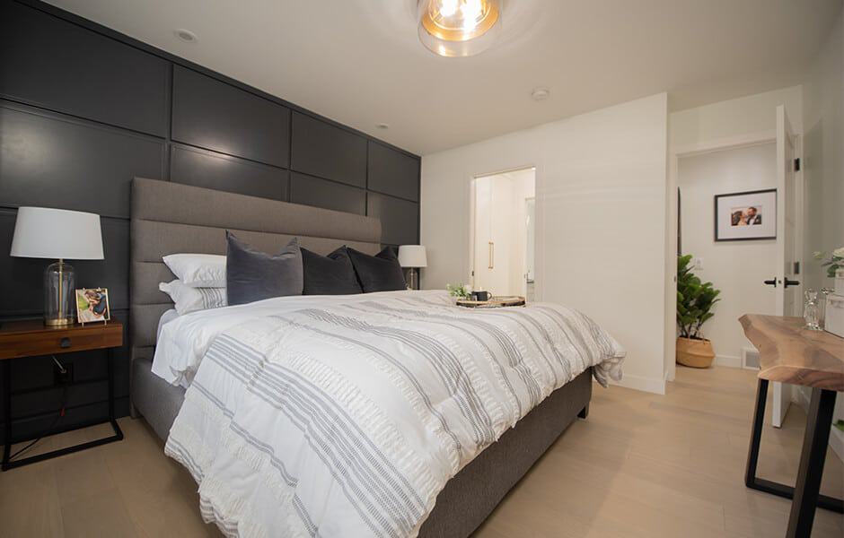 To really show our love to Jodi, we combined two bedrooms to create one awesome main suite. Along with the feature wall, highlighting their new, spacious king-sized bed, we used the extra space to give them a walk-in closet and a luxurious private bathroom. They can spend the day like it’s an all-expense-paid vacation to a high-class hotel.