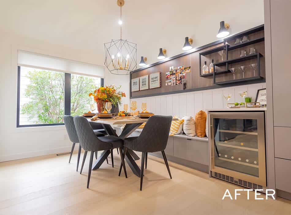 Game nights have been a stable of our friendship for years, so when designing the dining room, we made sure to improve plenty of storage and table space for board games. Behind the banquet seating, we also added a stunning magnetic wall where they can easily put-up photos and other decorations.