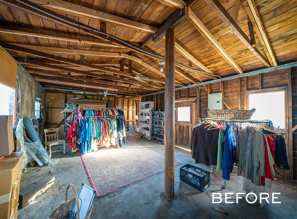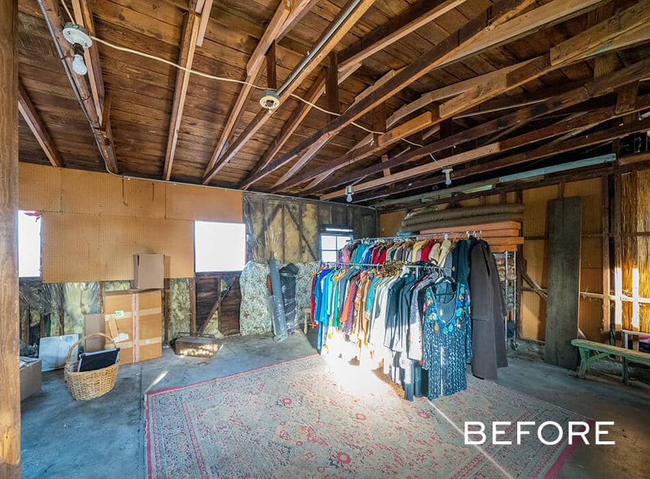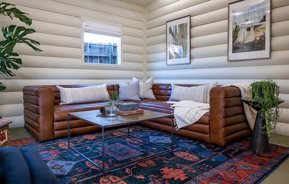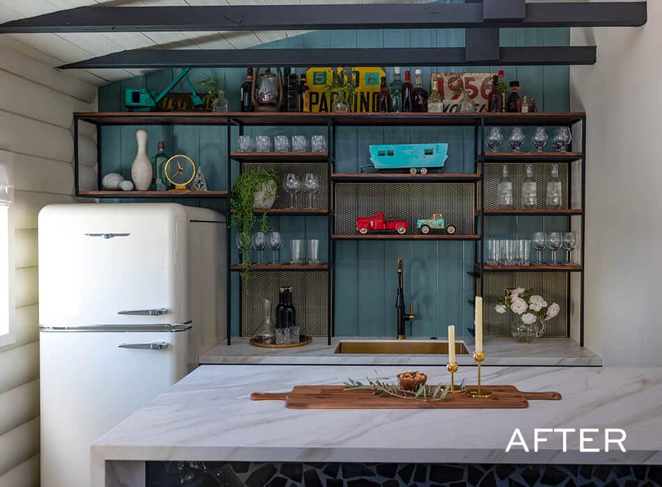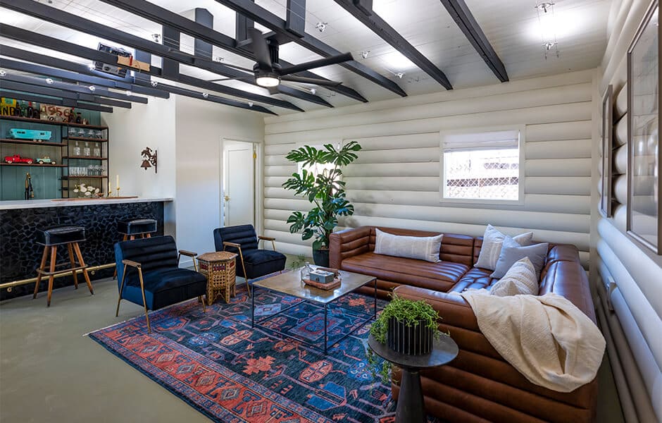 Before, the main function of the cabin was to store all the vintage clothing Johnny’s wife likes to collect. We took that empty space and turned it into a lounge where they can invite guests to hang out and relax, complete with a retro kitchenette and peninsula.