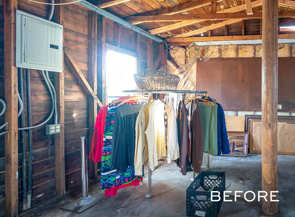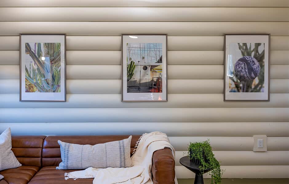 Johnny’s cabin was originally built in the 1920s, and he loved that rustic feel. So, we matched the original log veneer with new stylishly painted paneling. To complete the new look, we even got the original painter to create an updated sign for Johnny’s business.