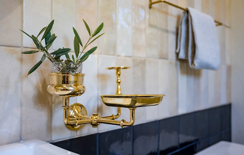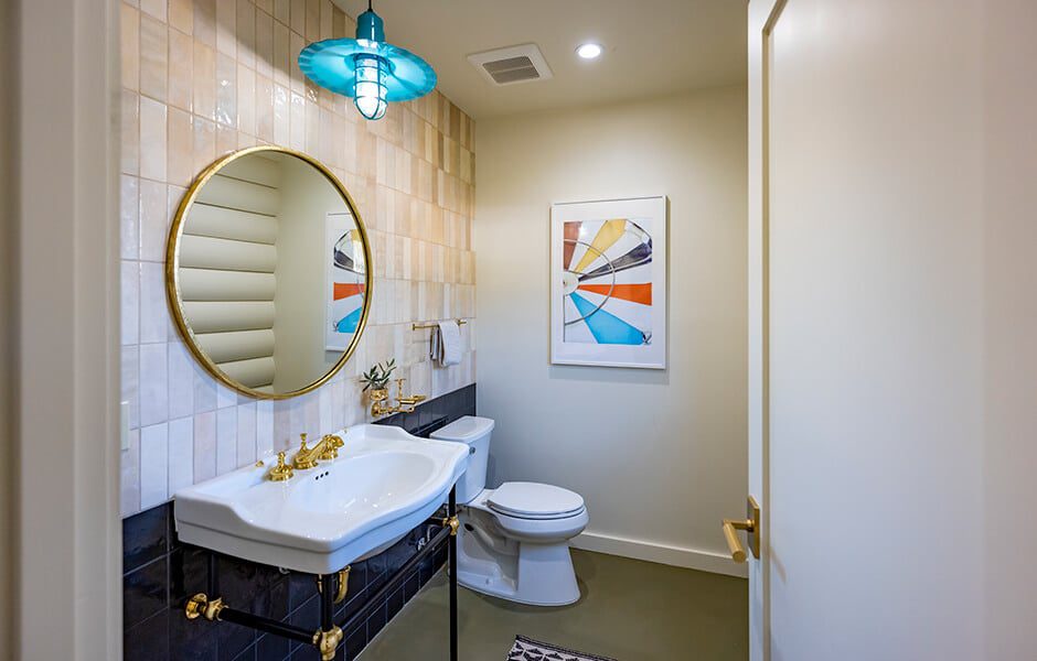 Nothing kills a party like having to rush back to another building when you need a restroom break. So, after installing in some plumbing, we were able to add in a luxurious, spacious bathroom that completed the cabin’s vintage look with its gold-accented styling.