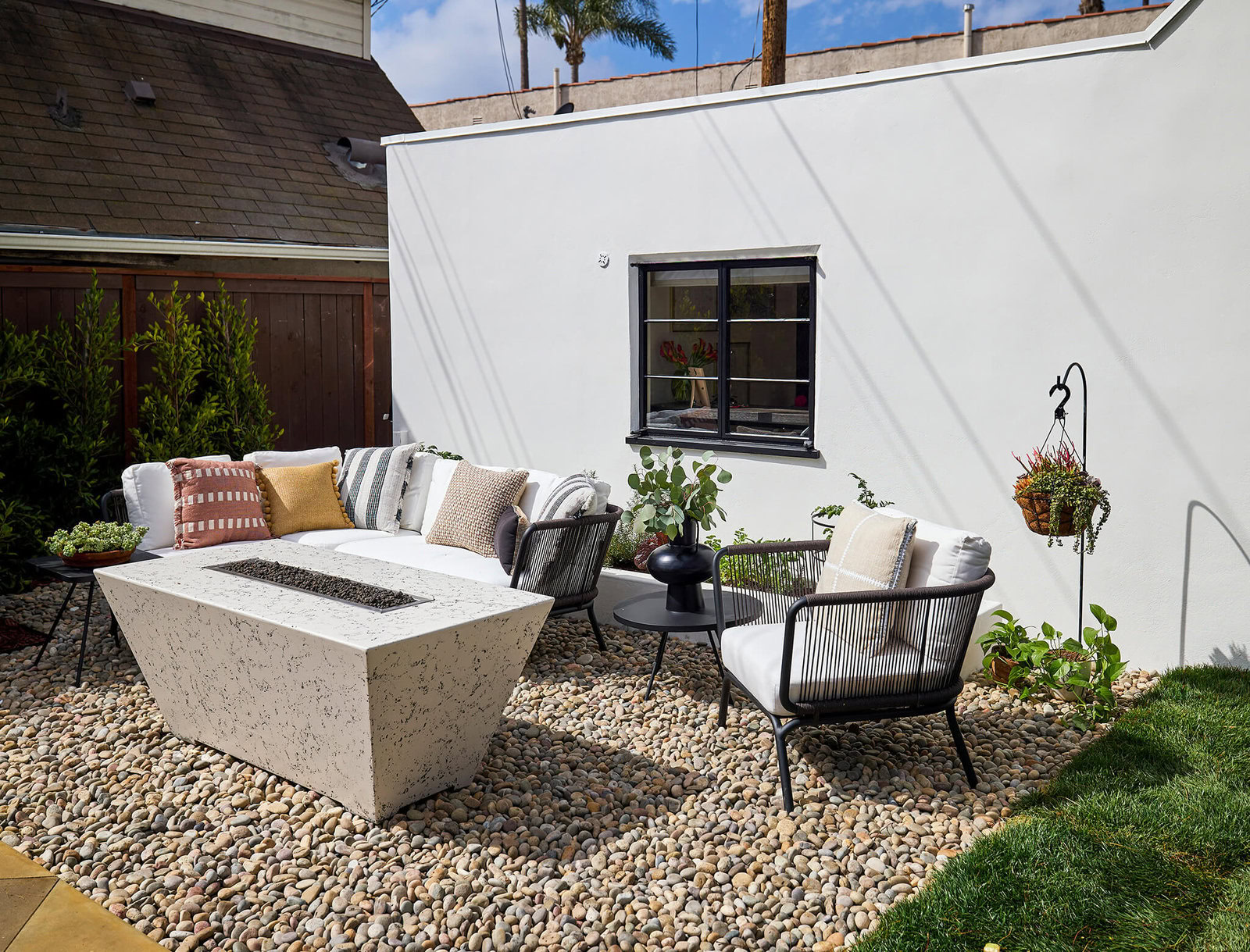 Finally, a place for guests to relax and gather in the backyard! Delia and Jeff now have a gorgeous fire pit, plenty of outdoor furniture to withstand the elements, and a beautiful pebbled floor that makes the space look chic and provide that cozy atmosphere they want. This way, they can have all their friends and family over to enjoy each other’s company in comfort.