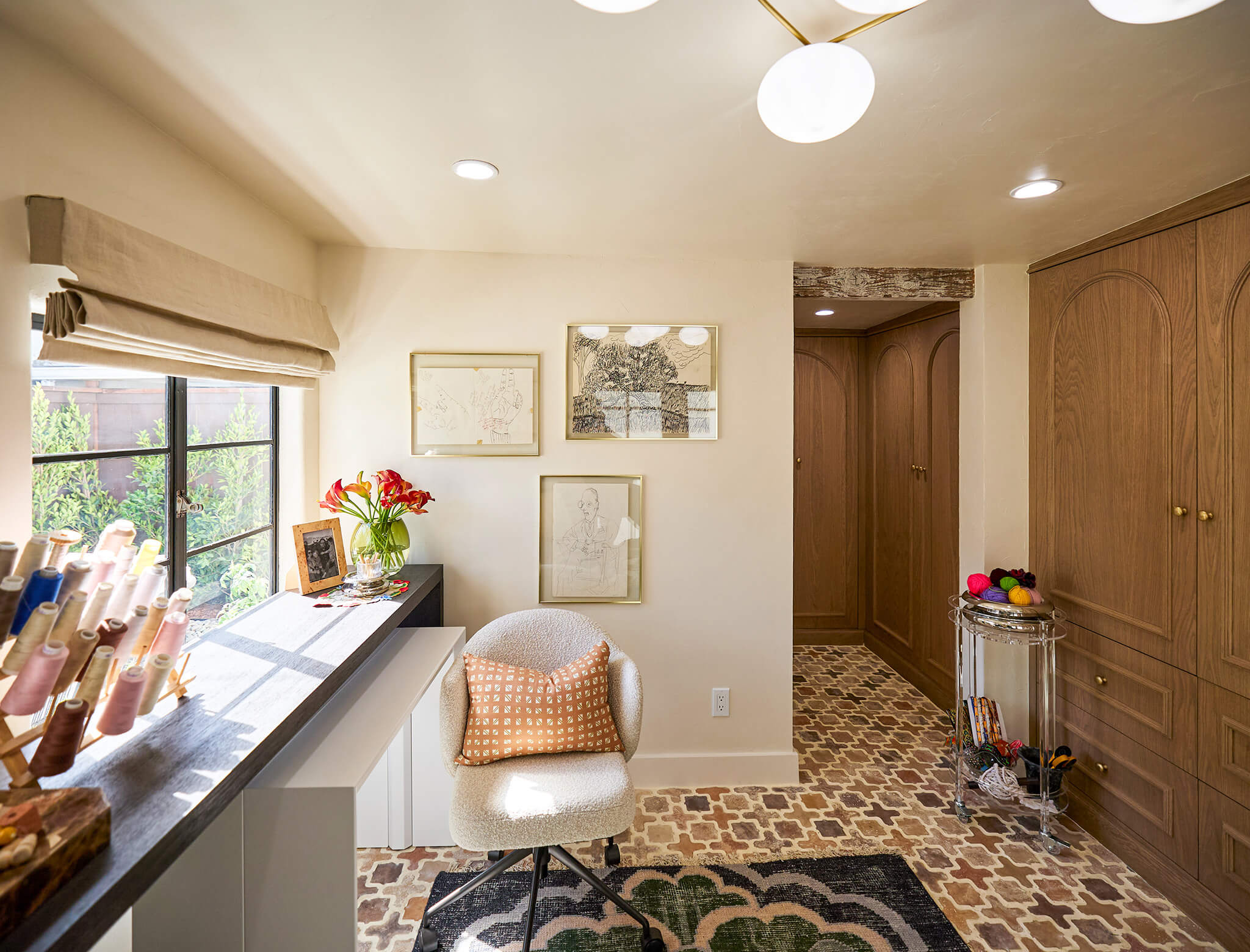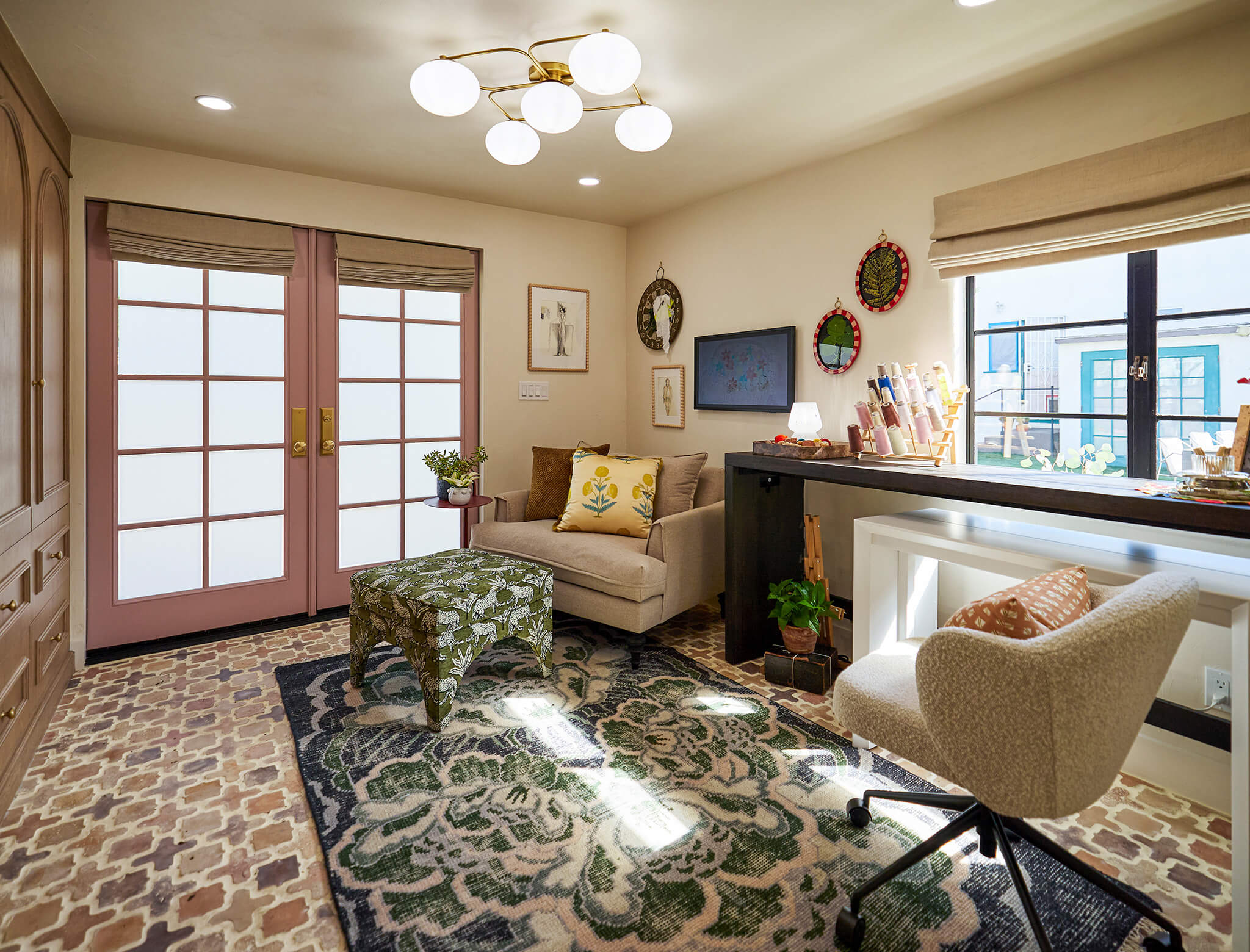 Delia wanted her studio to match her home’s Spanish Revival style, so Josh, Drew, and Jonathan decided to go with a tile that spoke to that design. Bringing in mauve and terracotta-colored tones helped ground the room and provide a beautiful backdrop to her workspace.