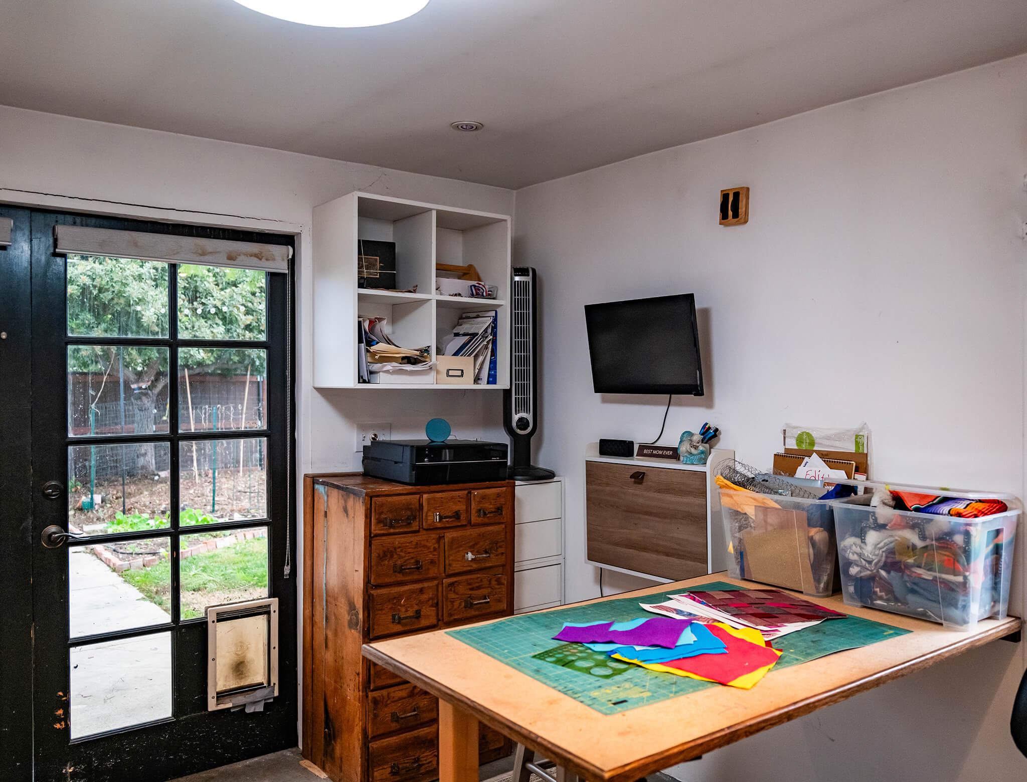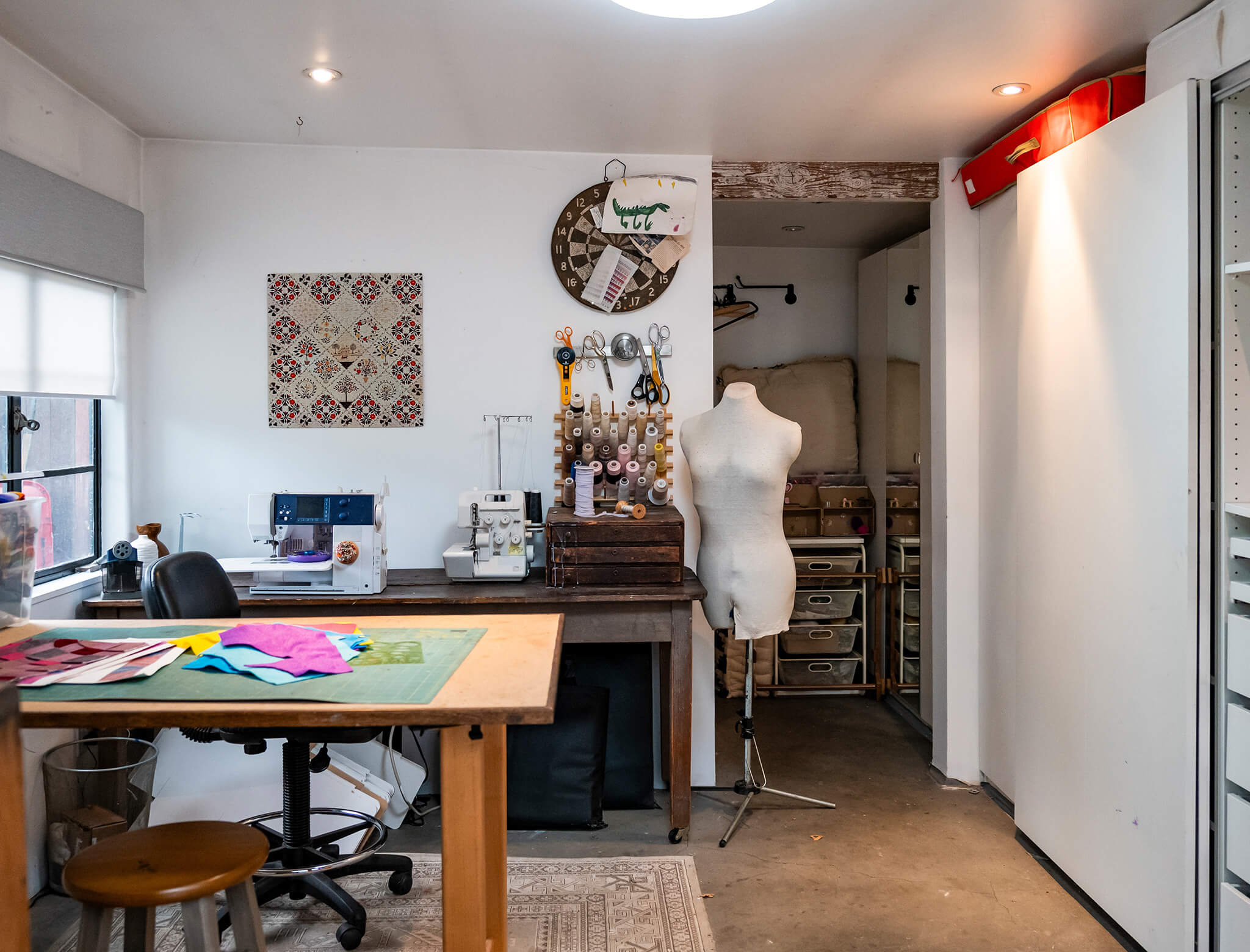 Along the walls, they replaced the old storage doors with more functional (and beautiful!) options that matched the rest of the room’s style and provided more organization. Drawers and cabinets line the walls all the way into the back corner, so Delia can make use of every inch of space.