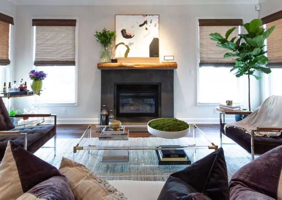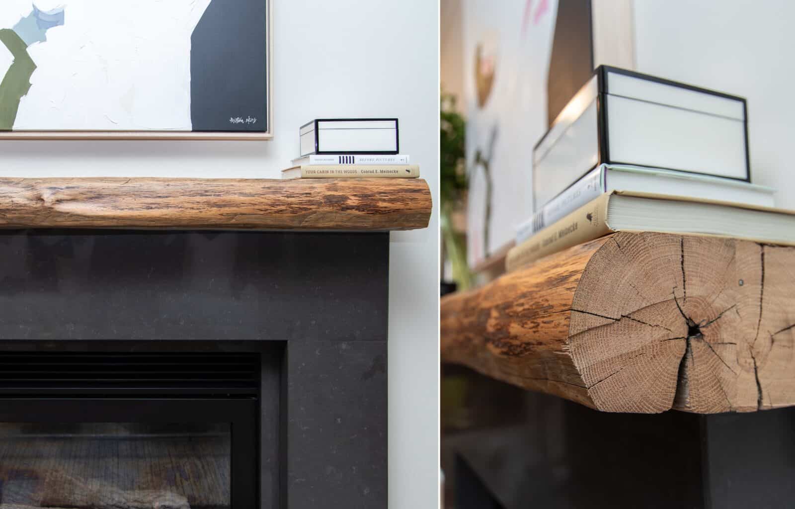 This living room needed a worthy focal point, so we updated the fireplace with a black slab surround and hearth. We topped it with a super solid (and super stunning) reclaimed wood mantel, which provides visual contrast, adds value to the space, and doubles as a rustic bookshelf—all at the same time!