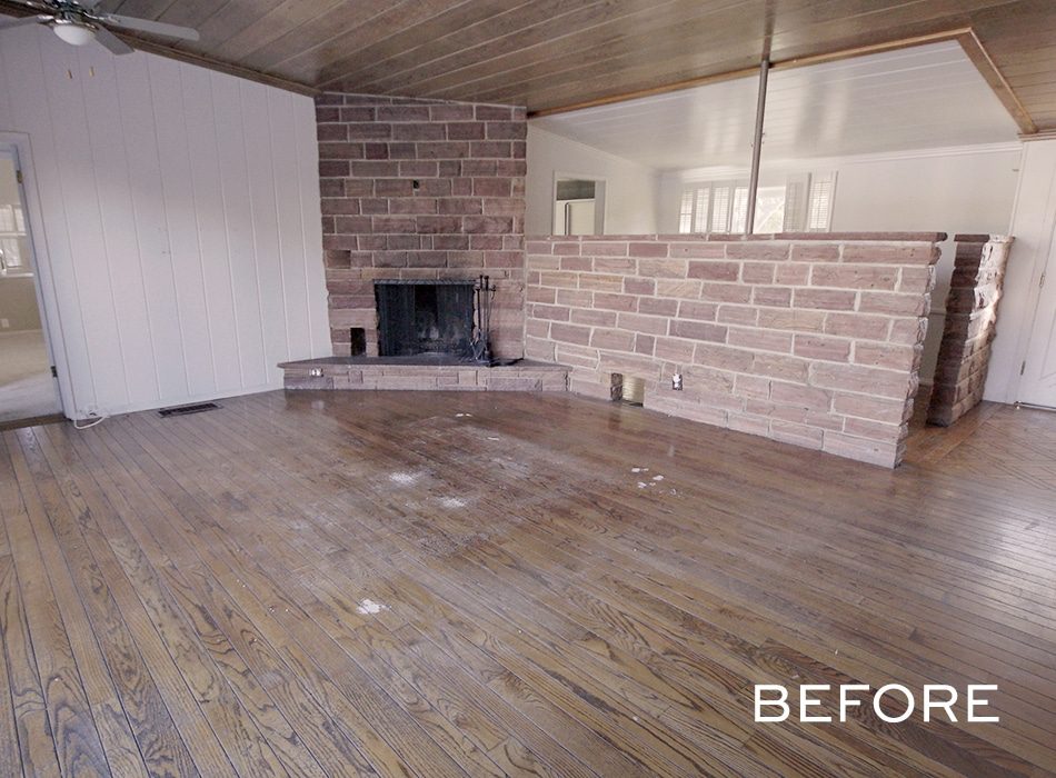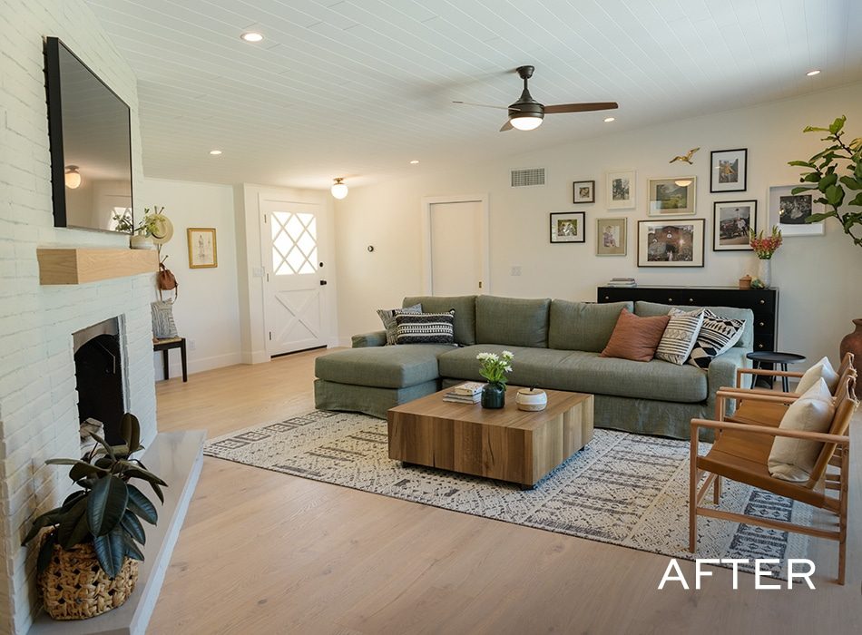 Once we tore out the old, boxed-in kitchen—and most of the rest of the home’s interior, too—we gave ourselves a blank slate to build Karina and Sam’s open-concept dream home. (Shoutout to the couple for their awesome demo work!) We kept the kitchen galley-style to work around the fireplace, and the new site-lines let Mom and Dad keep an eye on the baby from the kitchen—or basically anywhere else in the house. Originally, we were going to do all quartz countertops, but when Karina suggested a live-edge wood waterfall countertop for the island, we had to make it happen.