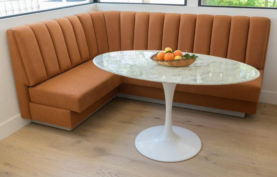 Sometimes, a house just hands you a gift: This is the home’s original built-in banquet, which we found while cleaning out the shed. Boy we were excited to see it was still in great shape! Score! Karina and Sam chose to reupholster the piece in this deep, retro color we’re calling “yam” in homage to its original orange hue. And the money we saved restoring this classic piece helped us come stay within our budget despite a few structural surprises we had to handle.