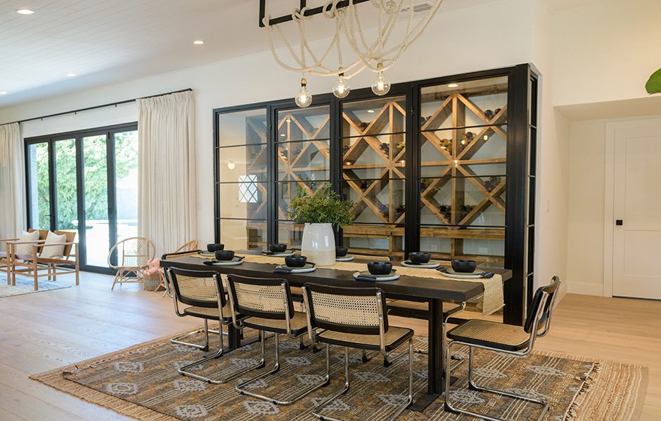 Sam lived in France for a few years and developed a fondness for wine caves—temperature controlled rooms containing a lifetime of wine, “each bottle with a story of its own,” he explained to us. The custom cabinetry in this wine room—the largest one we’ve built—and its black, bi-folding glass doors set it apart as an elegant show piece that perfectly complements the nearby table and chairs, creating a classy-yet-cozy dining and entertaining space.