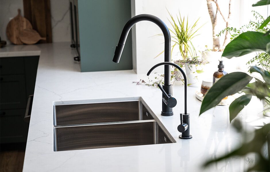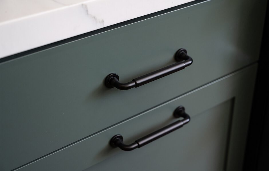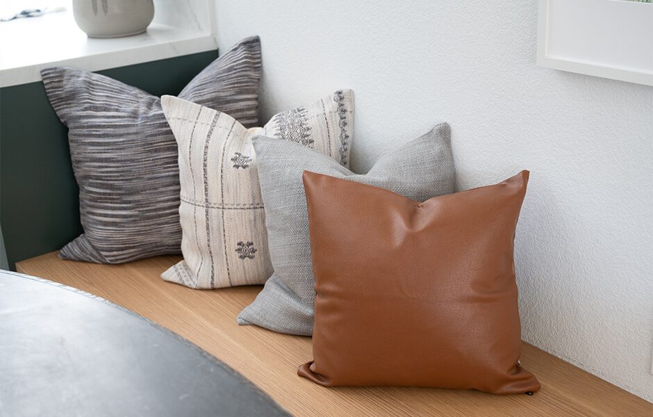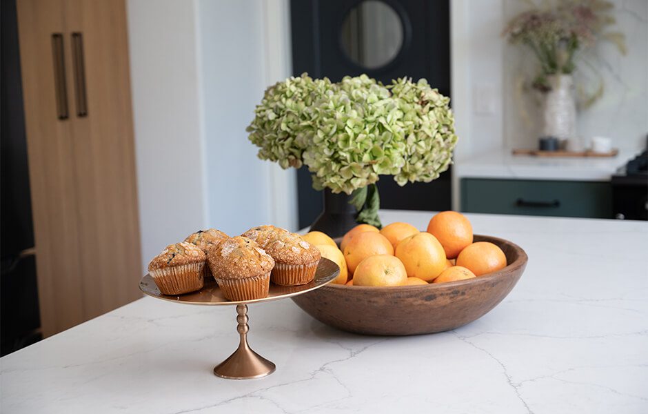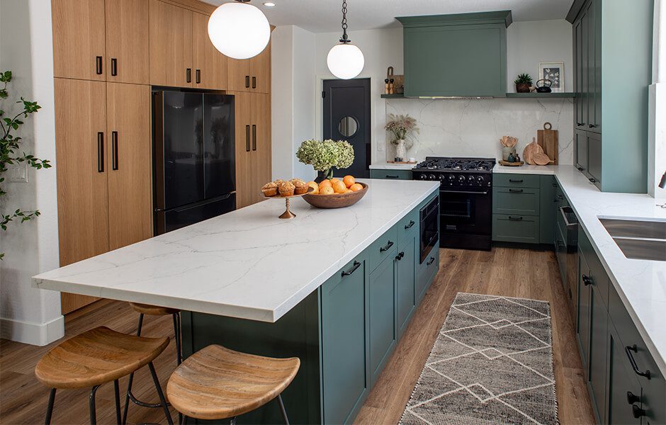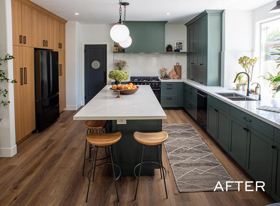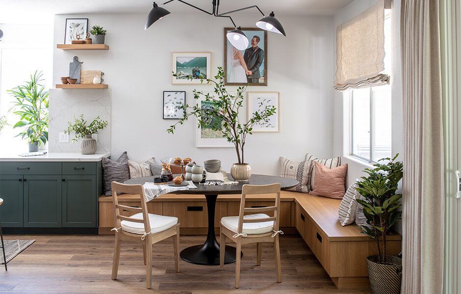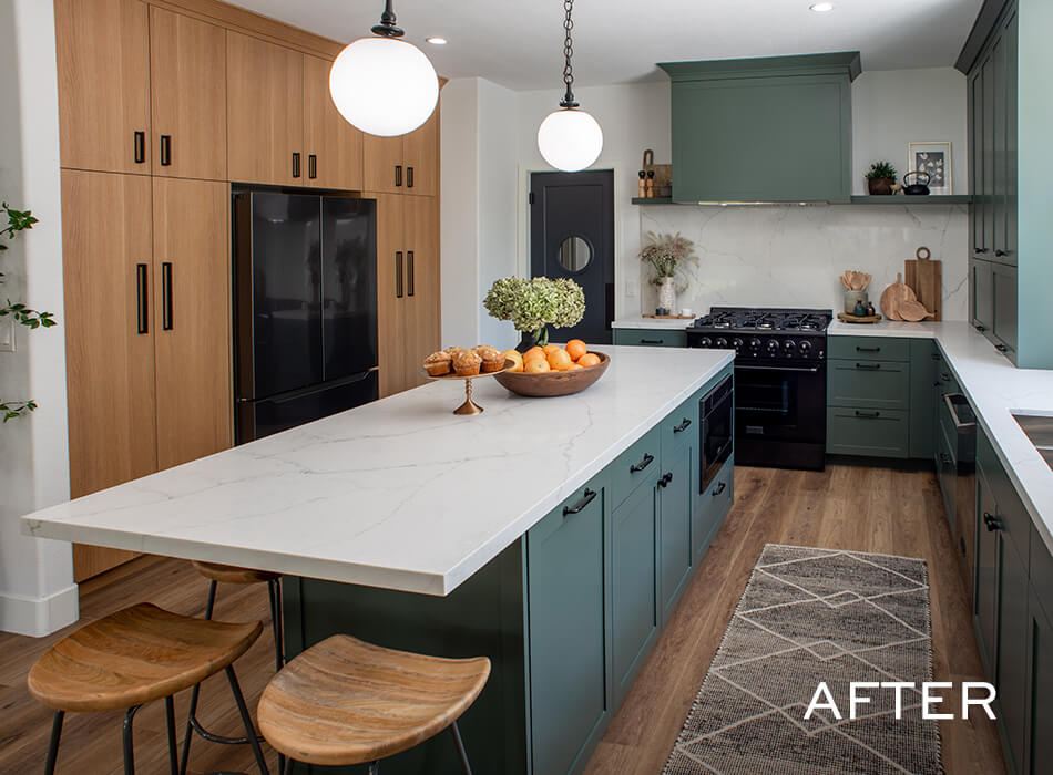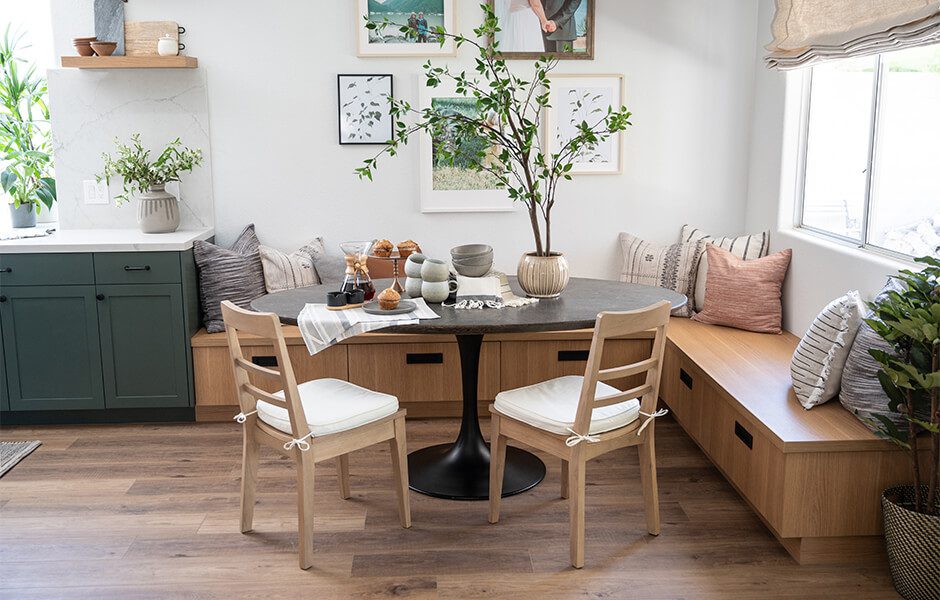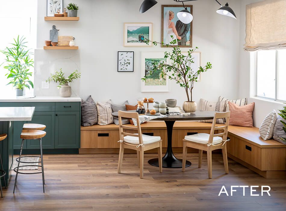 Katie and Jason’s original home layout had a dining room table jammed right behind the living room area, which wasn’t conducive to conversation and often led to some sneaky plate thefts, courtesy of their dogs. When we redesigned their layout, we added wraparound seating at the kitchen island so the whole family could see each other–and keep an eye out for any four-legged bandits.
