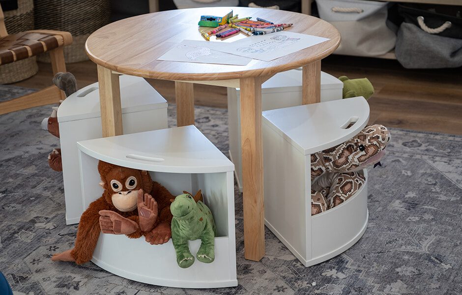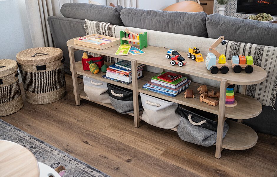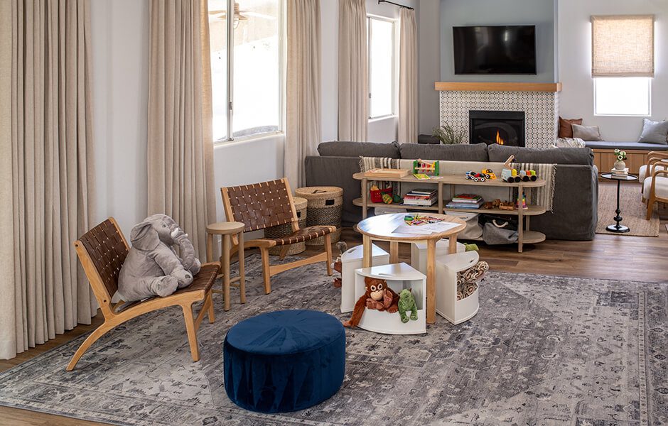 A kids’ play area was a must in Katie and Jason’s Forever Home. Creating a welcoming environment for children entering their home for the first time would show them they were in a safe, loving home. We placed the kids’ space in the middle of the home, so the family’s two new arrivals would know they were the center of the home and of Katie and Jason’s lives.