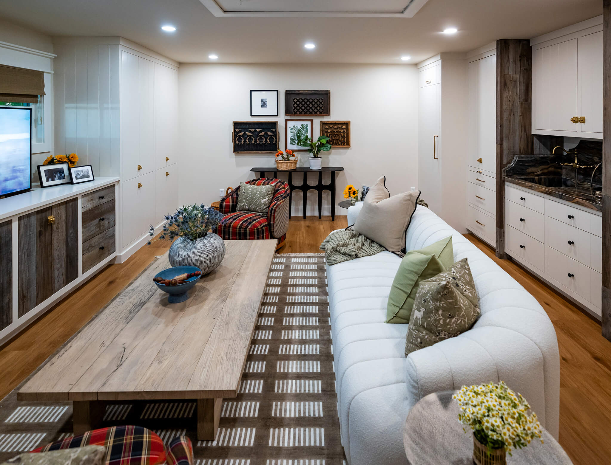 Custom cabinetry behind the sofa conceals a fridge and kitchenette, with plenty of storage and even a hidden laundry folding station. The carriage doors are a serious upgrade from the old garage door, too! It’s a far more sleek, elegant option that creates a style statement both inside and outside.