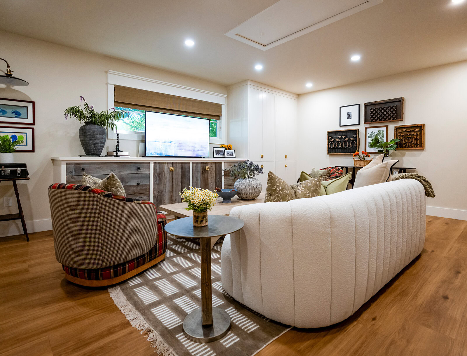 The flex space Kyle, Drew, and Jonathan created has a bounty of opportunity: It’s a beautiful rec room for MT, Joe, and Maddy; a great chill zone for family parties or sleepovers; a functional space for storage (especially with the addition of the attic space) and laundry; and can easily turn into a gorgeous guest suite when Arlene needs it.