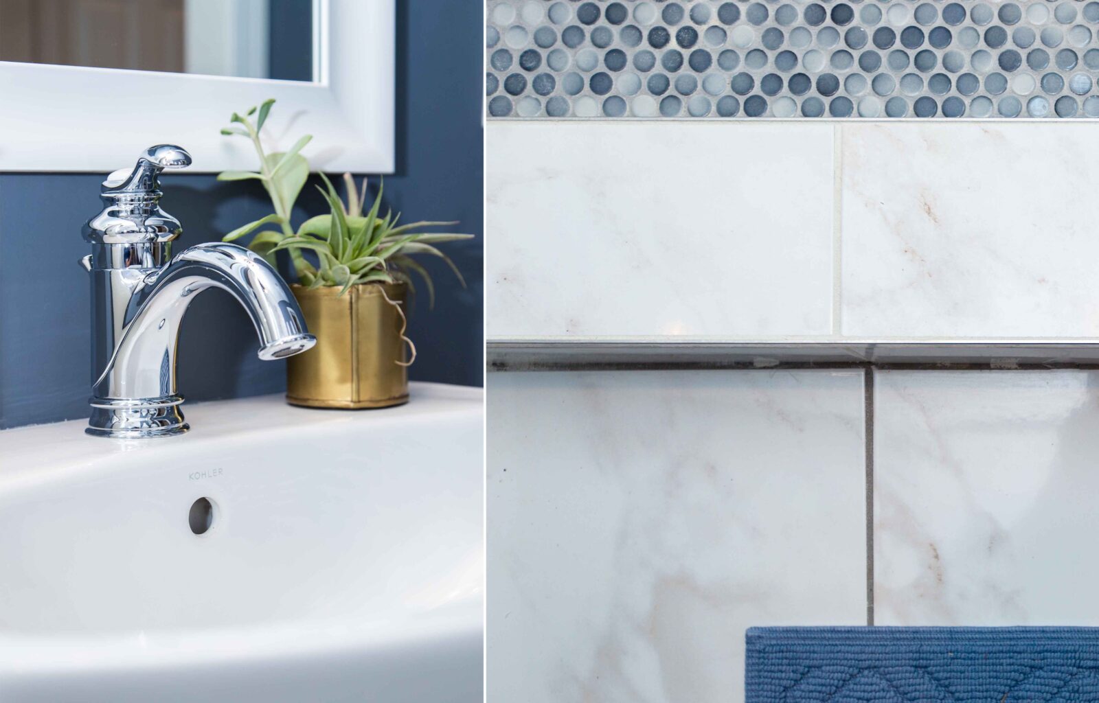 We loved the blue-gray fireplace so much that we carried that color scheme into the hallway bathroom. We replaced the existing bathtub with a shower and updated its overall look and feel with small mosaic tile. The other major space-saving feature here was a new vanity with a pedestal sink—this room is now unrecognizable in the best way possible.