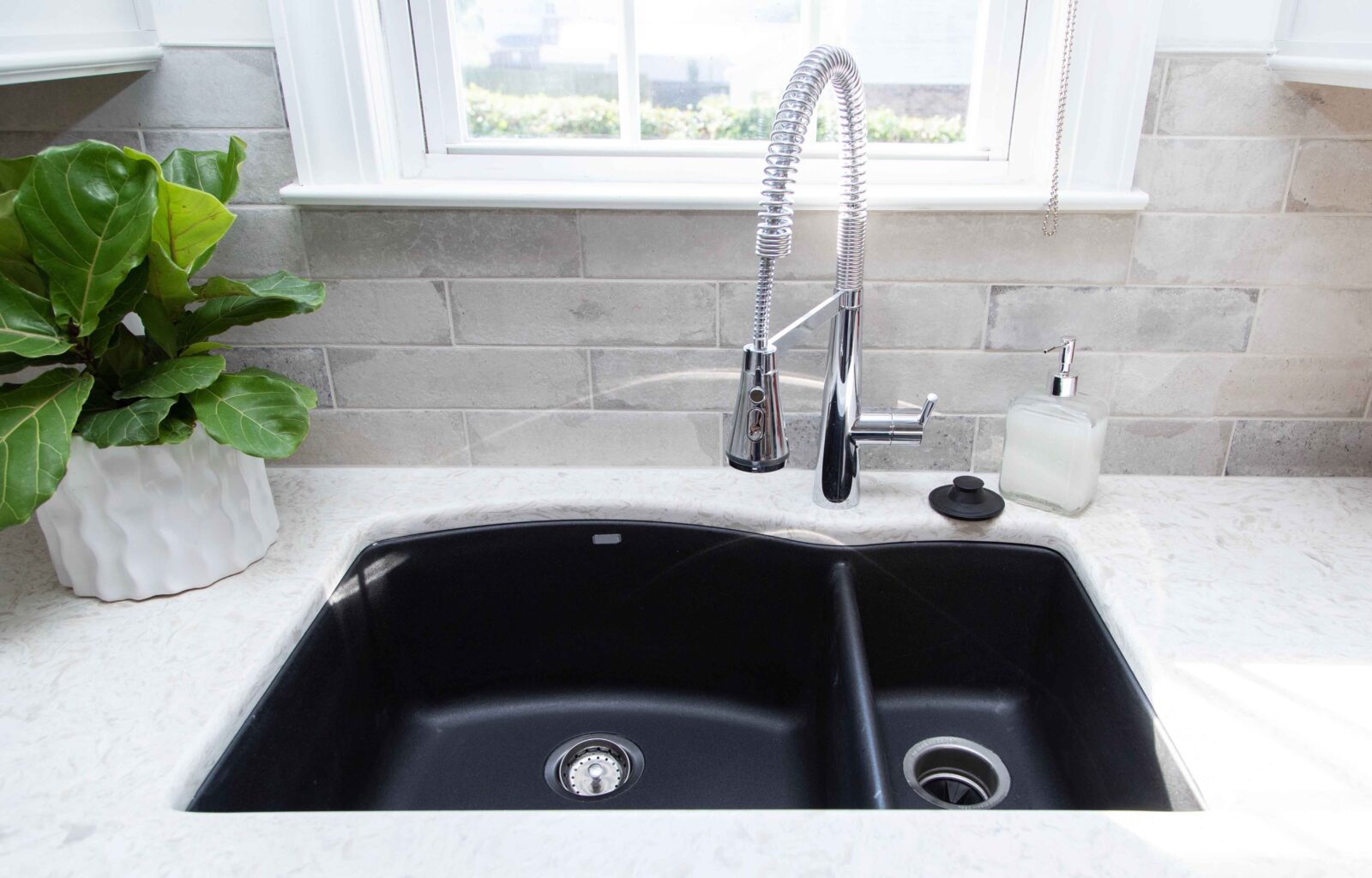 With two active kids and plans for countless visitors, LaShawnda and Daniel wanted their home to be as easy to clean as possible. This kitchen sink has an ash-colored granite basin—in addition to never looking dirty, the material is famously resistant to scratches and stains. The dark shade also adds a pop of contrast to the newly light and bright area.