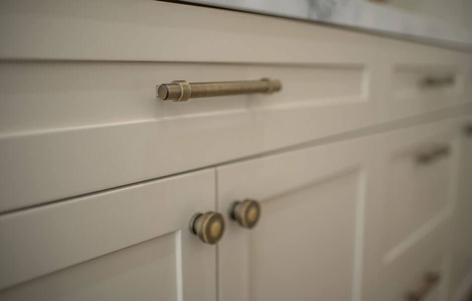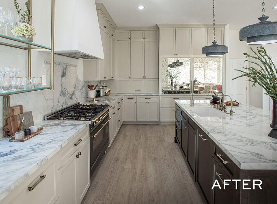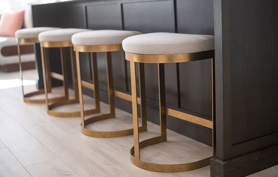 Lisa insisted she was ready to go for the Las Vegas glitz and glam, so we went there with aged brass fixtures and seating—but that wasn’t all. To bring a little extra to the kitchen, we installed custom antiqued glass panels to mirror some of the recent makeovers of the local casino resorts. Keeping it classy, Vegas-style.