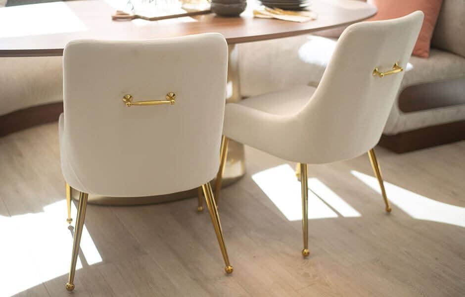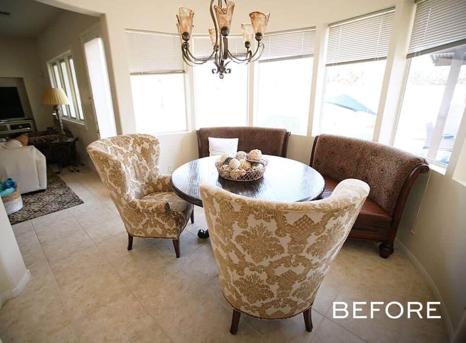 Lisa and Jay’s dining area was a nearly fully enclosed circle, which we promptly made a semi-circle by demolishing the wall curving into the kitchen. We could have evened out the exterior, too, but we all decided to steer into the curve (get it?) and turn this bump-out into a standout. New window treatments, a plush banquette and a stunning chandelier perfectly frame the round, metallic-base dining table that will work equally well for poker nights and Taco Tuesdays.