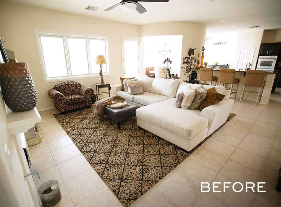 The fireplace was in pretty good shape, but its positioning in the animal print-clad living room was a bit off. We centered the feature between decorative wall moldings to provide symmetry to the previously lopsided room, and styled it with seating that gave the room a more finished feel. Oh, and we might have added sliding doors that lead right out to their stunning pool.
