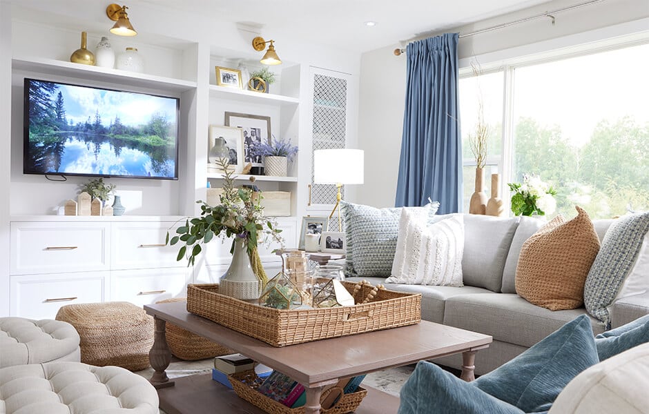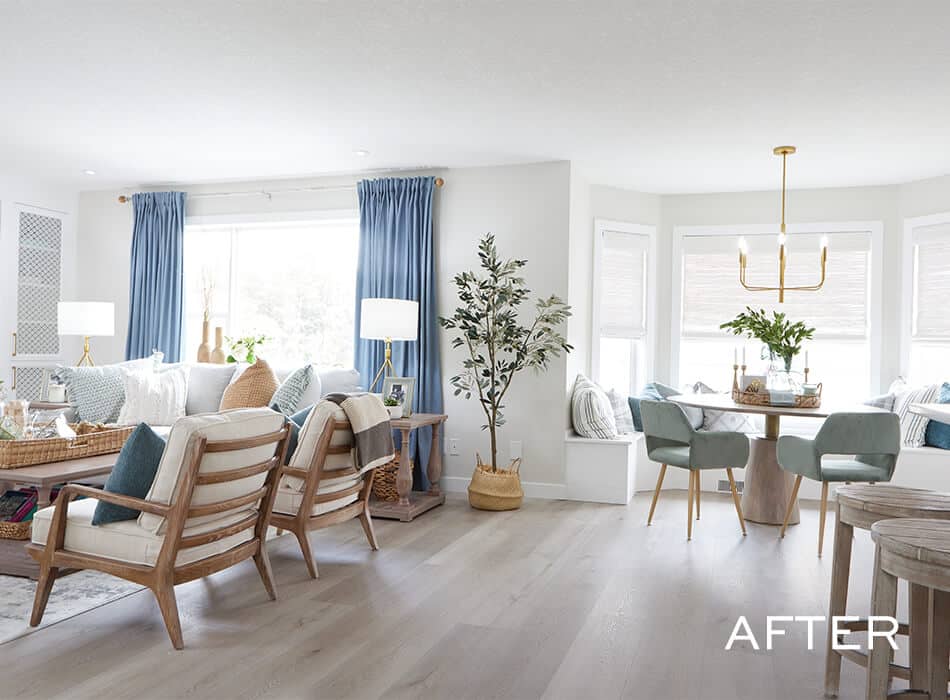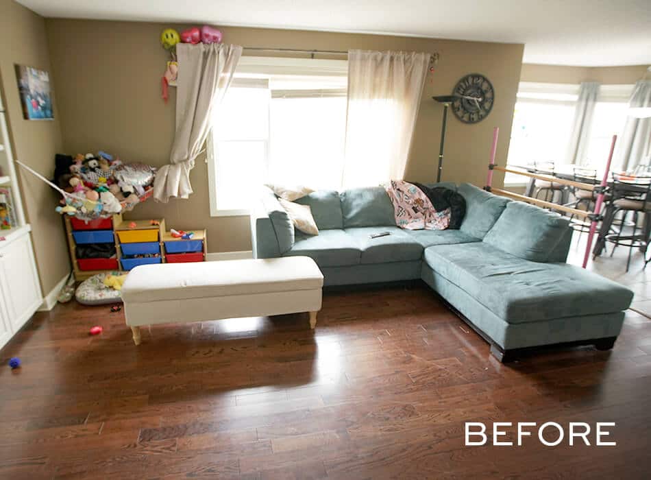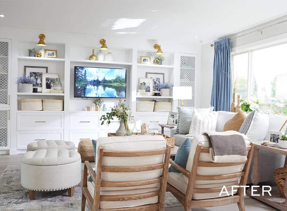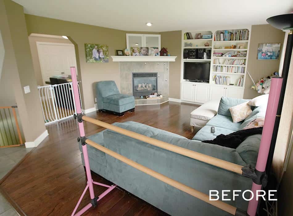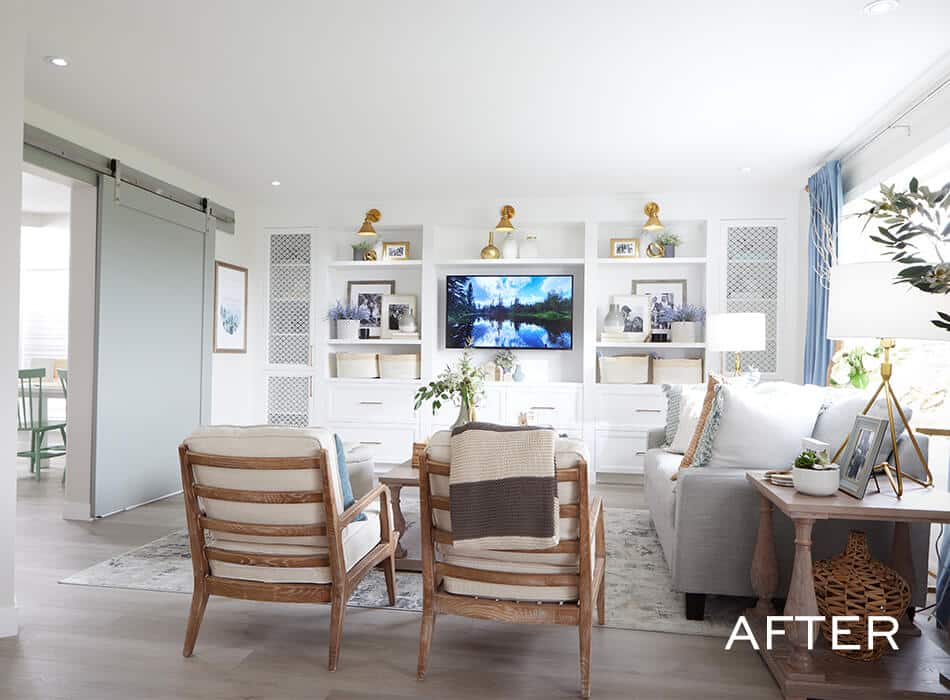 Before, the focus of the living room was split between a fireplace that wasn’t seeing much use and a TV they preferred to gather around. We removed the fireplace so we could turn the back wall into a dream media center with plenty of built-in shelves. Plus, the new elegant and light seating is still comfortable but reflects their adult tastes better.