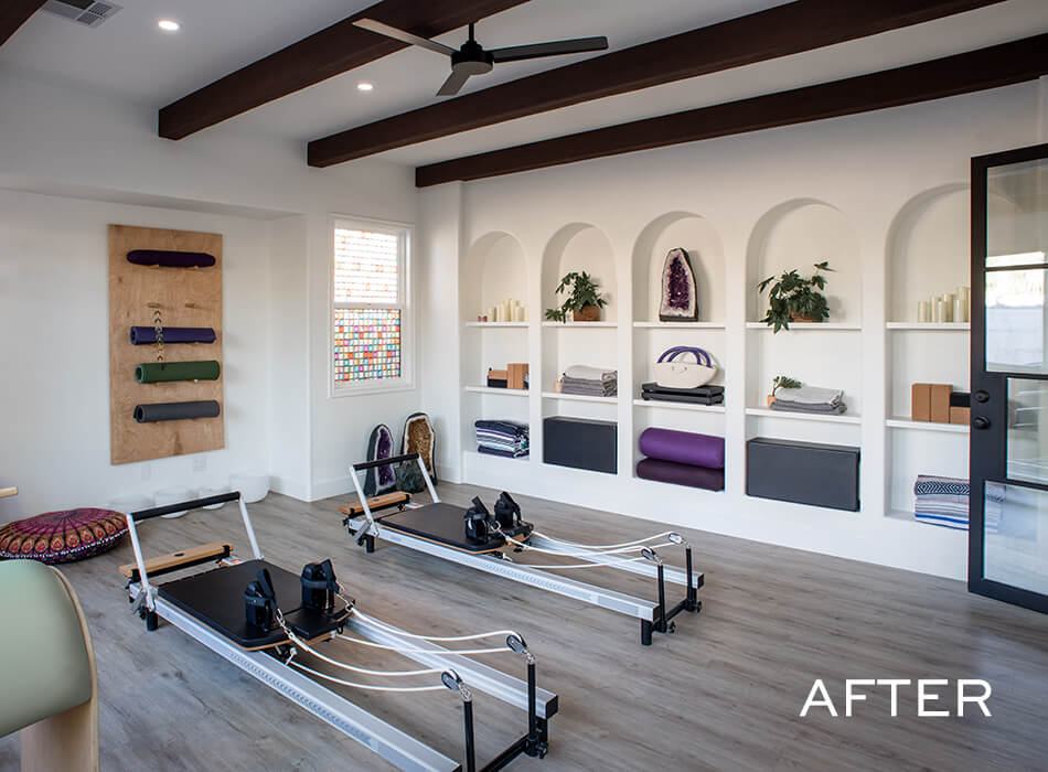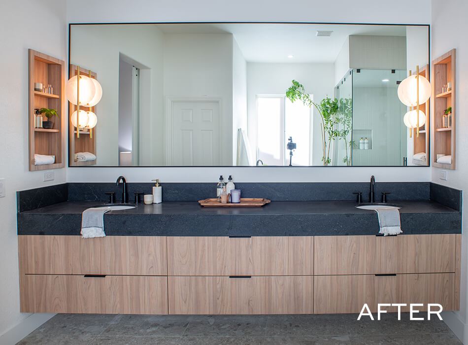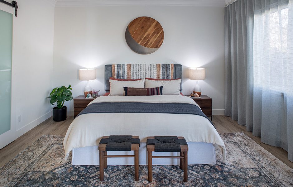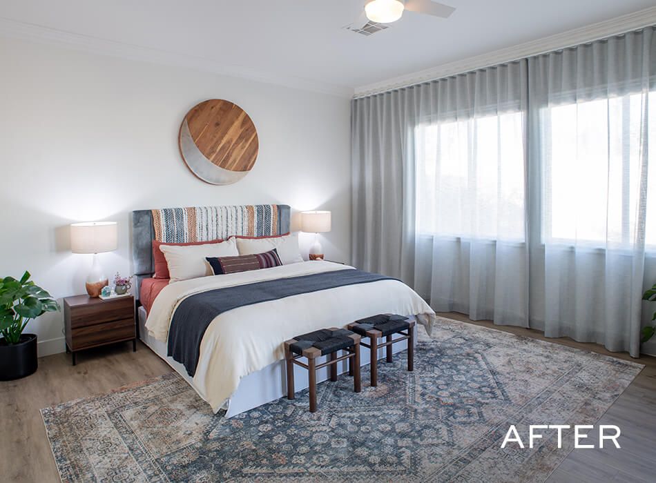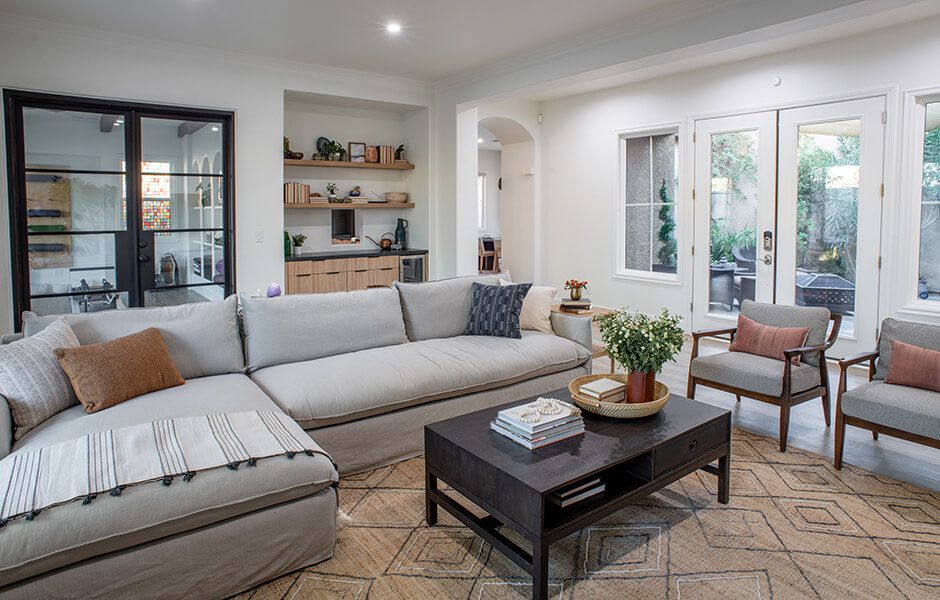 Marcie is an Air Force veteran, cancer survivor and was looking for a fresh start for her and teenage daughters Alyssa and Paige when she bought her home over a year ago. Marcie turned to yoga to heal her body and mind and found a supportive community of women in the area that became her family. Marcie loved her rental so much she bought it from the landlord, but it was far from perfect. We overhauled the living room, kitchen, wellness studio, primary bedroom and bathroom to transform the house into the fresh, balanced sanctuary of Marcie’s dreams.