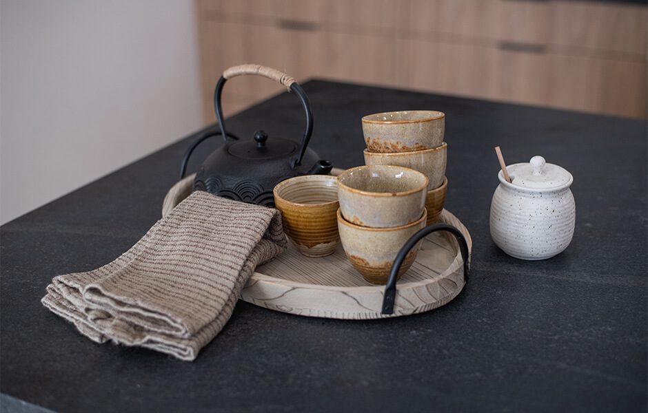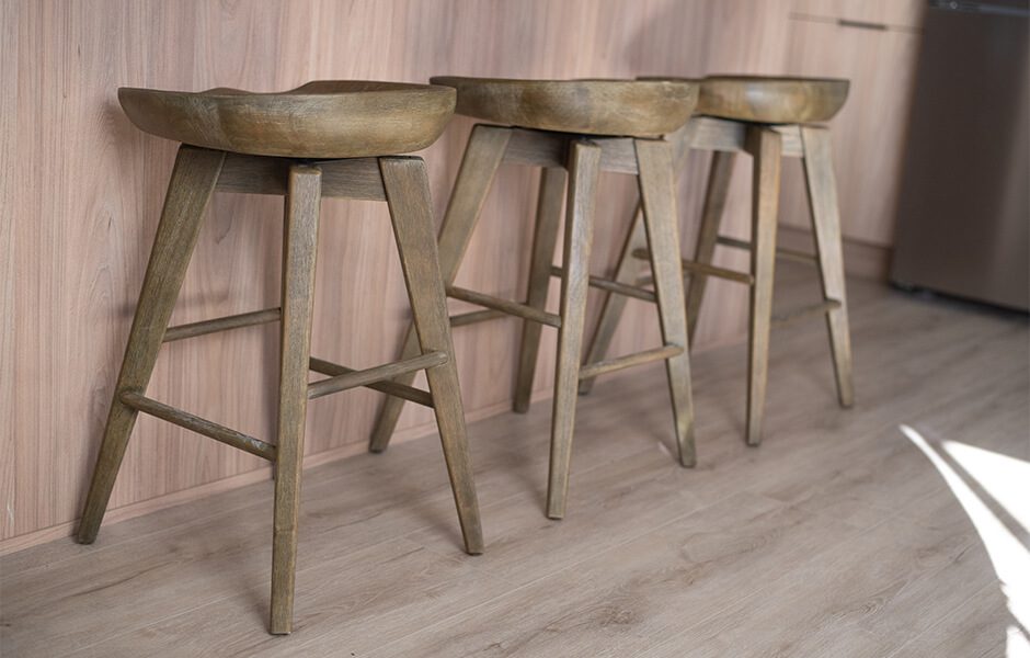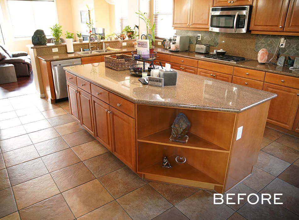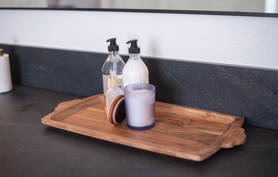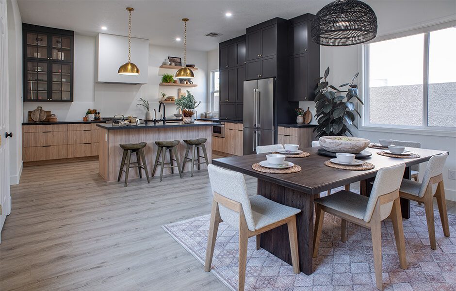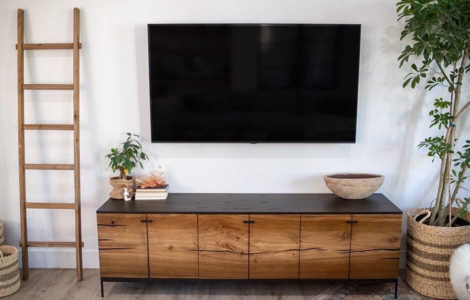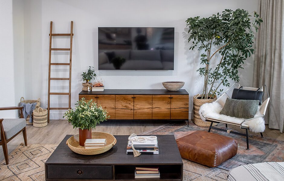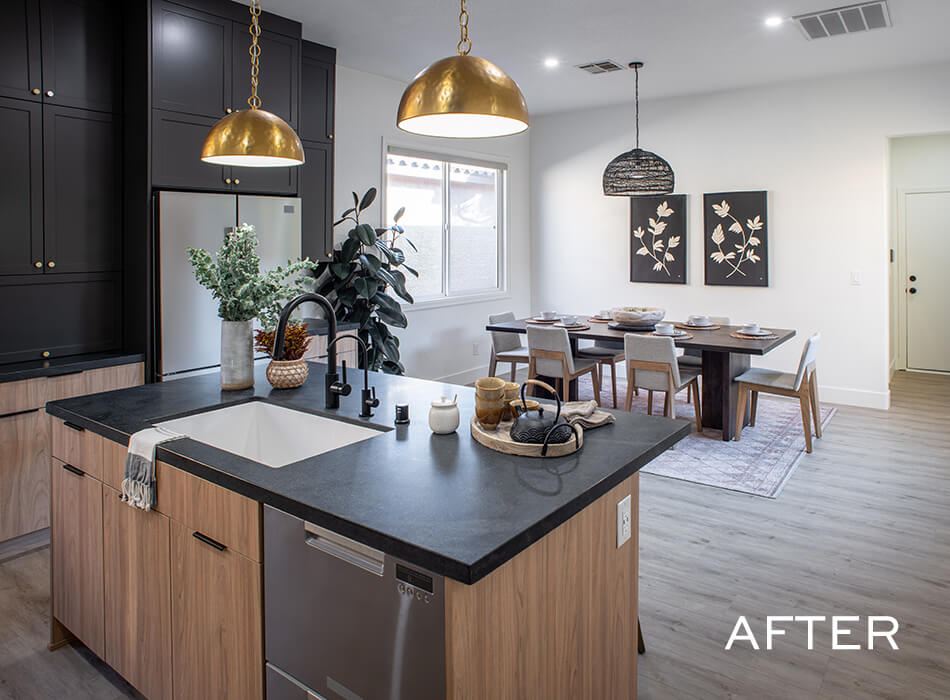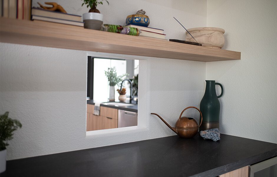 We carried the natural look of Marcie’s living space into the kitchen with wood tones and dark cabinetry offset with metallics and a simple backsplash. Every room in Marcie’s house should evoke calm, ease and peace—no easy feat in a typically bustling room like the kitchen, but we think it got there. We added a passthrough from the living room so Marcie and Alyssa could focus on family and guests and leave the mess for later.
