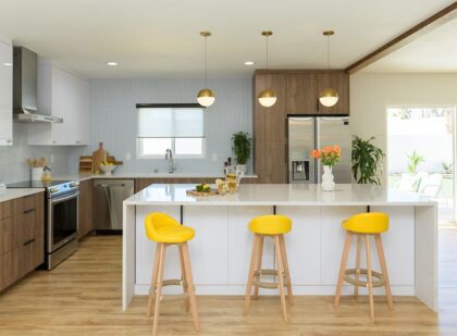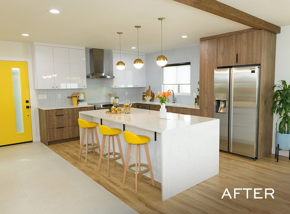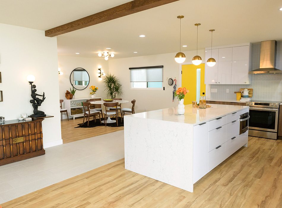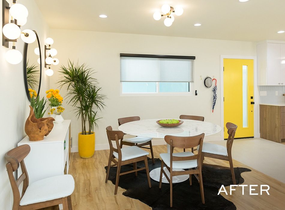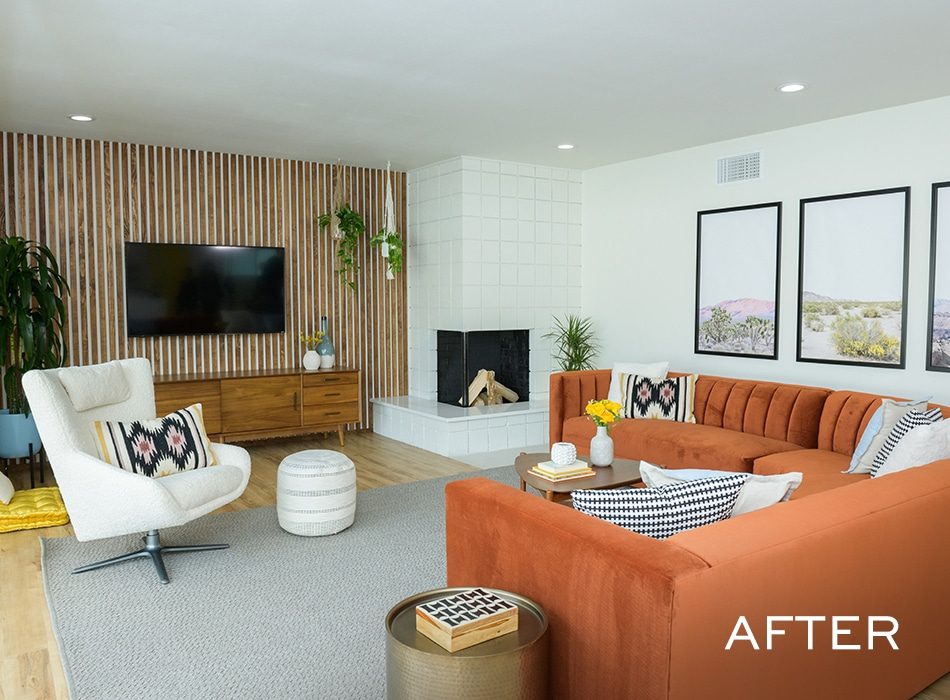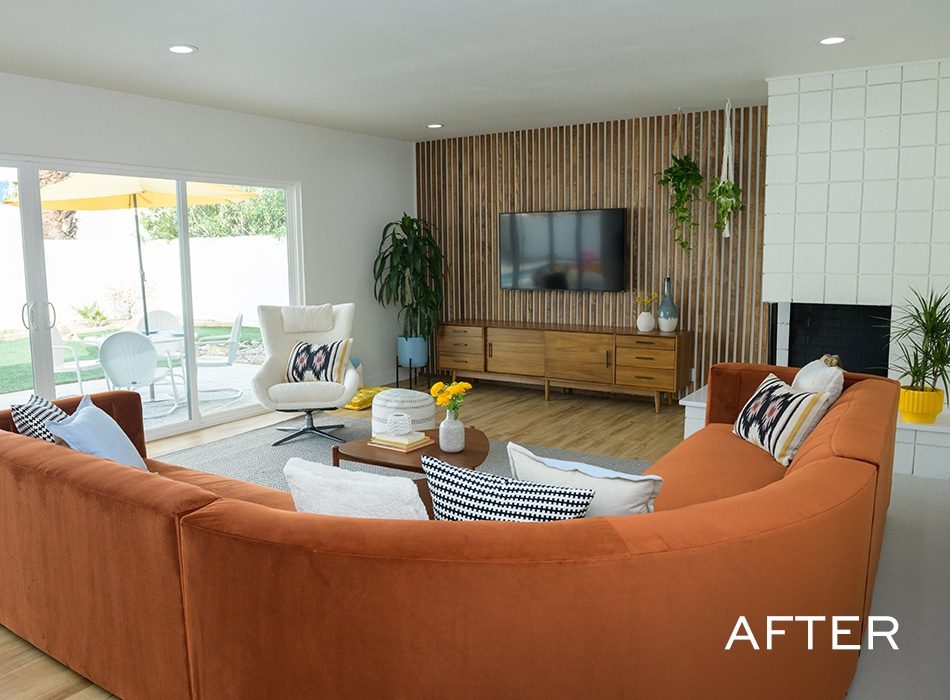Mark and Dave had big dreams of a mid-century home with an open layout and ample room for entertaining. We found them a fabulous 1,700 square-foot ranch built in 1961 (by the same architect who built one of Liz Taylor’s homes, no less!) that they were willing to take a chance on. Our plans included removing a fourth bedroom to make way for a dining room off the kitchen, updating the original fireplace, and making sure both owners have space to call their own without sacrificing room for houseguests. While the renovation didn’t go exactly as planned, we ended up with a bright and fun space that checks all their boxes.