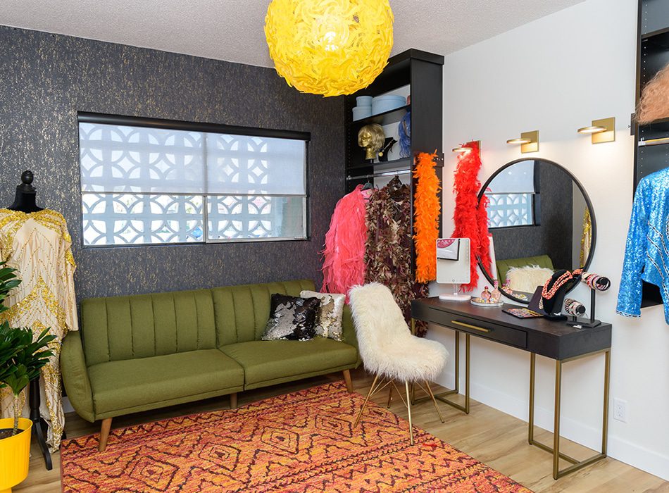 Last but not least: Margo’s room. Mark’s drag persona Margo is busy booking shows and working the stage, and at the end of the day, she really just needs a place to hang her wig. Her new dressing room is fit for a star: it has plenty of closet space, versatile lighting, and custom-designed pegs to hold her wigs. And see that gorgeous green couch? It actually pulls out into a bed, just in case Margo—or one of the guys—has a guest stay over.