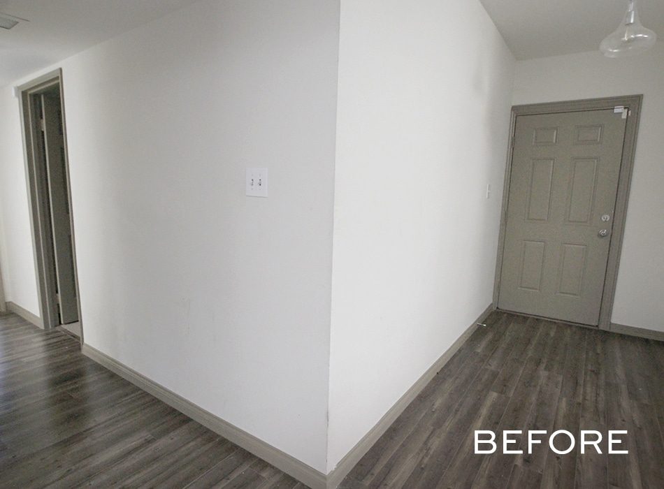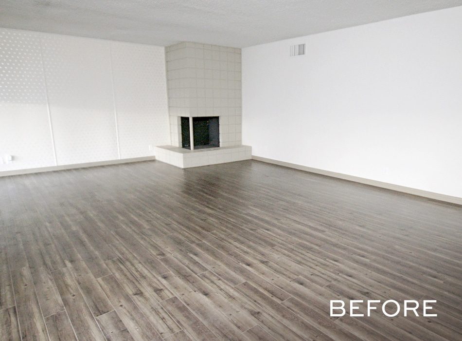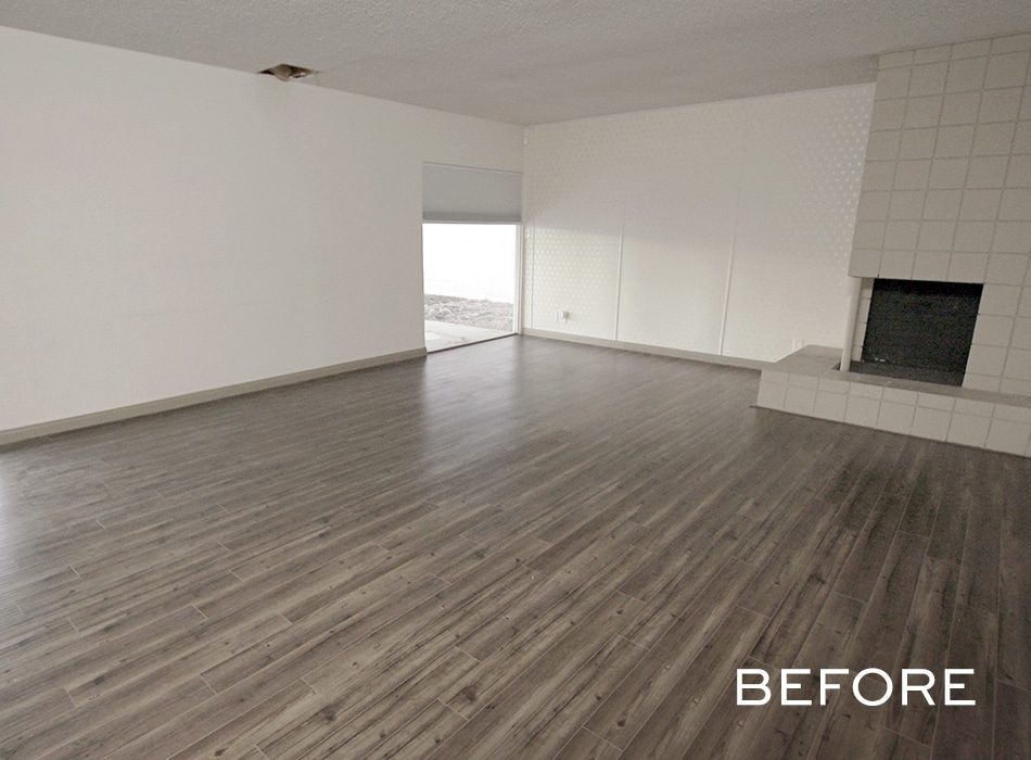 The fireplace is one of the first things you see upon entering the house, so it was important to make it feel less mid-century meh and more mid-century meow (Drew’s words). A fresh coat of paint helped modernize the classic structure while keeping the original stone detail, while a runway made of white tiles draws-in the eye from the doorway.