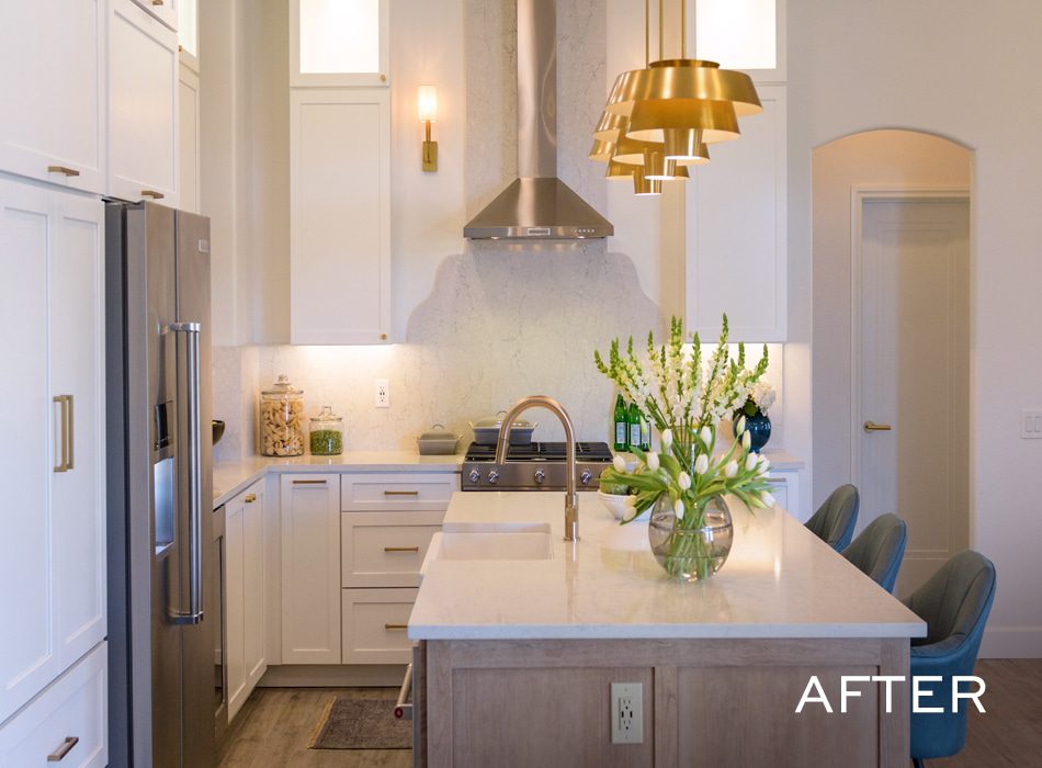 The home’s previous owners had built an eye-sore of a peninsula out of rock that looked more at home outdoors than in. And on top of being ugly, it also totally blocked the flow of traffic. We quickly took a sledgehammer to the monstrosity and replaced it with a much more pleasing island that’s perfect for entertaining—and we knocked out the wall between the kitchen and dining room to give Mike and Sophia the open-concept layout they were looking for. Additionally, we installed new Shaker-style cabinets, stainless steel appliances, and marble-look quartz countertops, which all make for an elegant and functional kitchen.