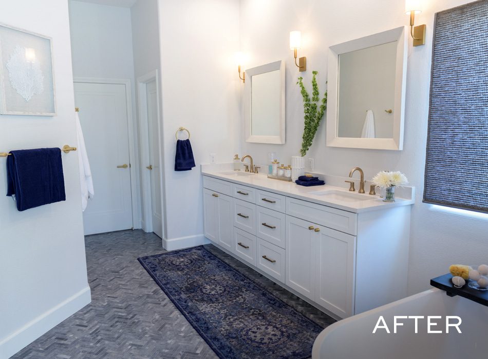 One of the couple’s must-haves was an spa-like master bath. To accomplish this, we tore out everything and put in a large double vanity, borrowed square footage from the master closet to create an oversized walk-in shower set off by a fixed glass panel, and installed this gorgeous, freestanding tub. Grey herringbone tile flooring is durable and elegant, and the same gold fixtures used throughout the rest of the house offer a youthful finishing touch.