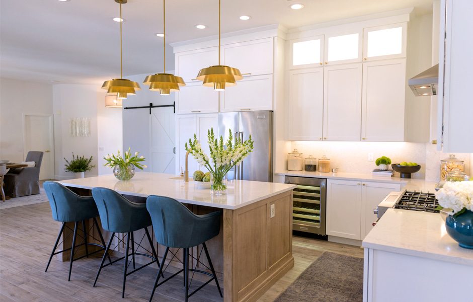 Mike and Sophia plan on doing lots of entertaining in the years to come, so it was important to create a cozy space to host friends and family. And what’s more cozy than a fireplace? We replaced the home’s wood-burning unit with a gas model, built a new mantel, and topped it off with a bold, geometric marble tile to really make this feature pop. The result is a classic statement piece that adds a cozy but modern touch to the home’s main indoor gathering place.