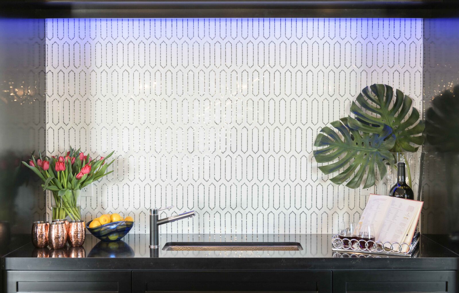 We knew the bar in the game room had to look cool and sexy, but equally important was function. We included plenty of wine storage and a super-fun champagne trough sink. The radiant backsplash tile—a combo of silver and pewter mirror—contrasts beautifully with the swanky black cabinets. Mix in the stylishness of Mindy and Paul, and their guests will always want to be at their new home!