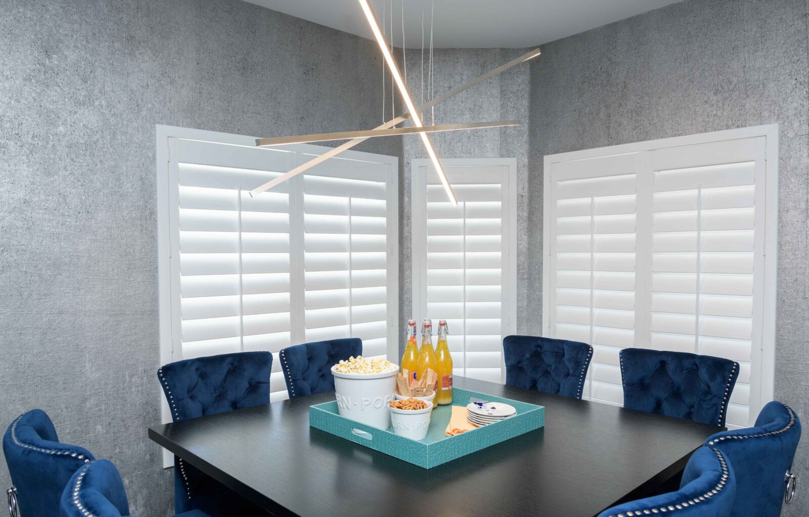 We transformed Mindy and Paul’s breakfast nook into the perfect area for playing games with friends. The ingredients: a modern minimalist light fixture, bold blue velvet chairs, and a super-textural silverish-gray wallcovering.