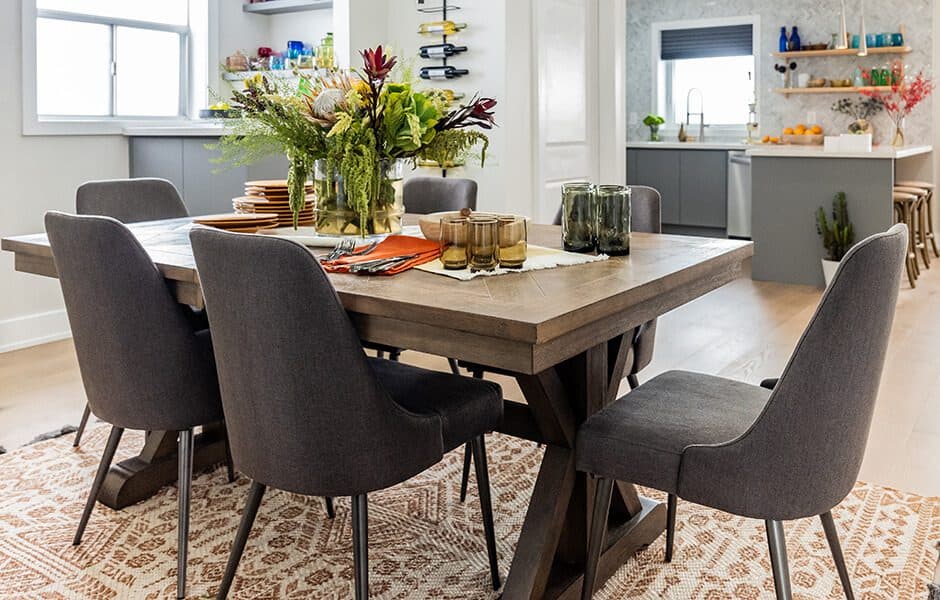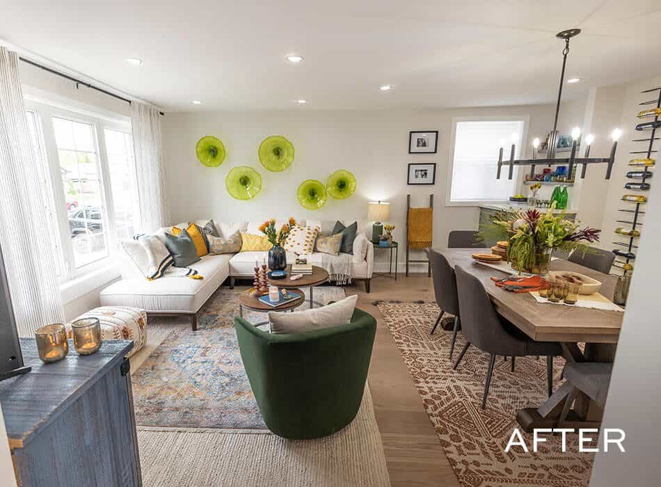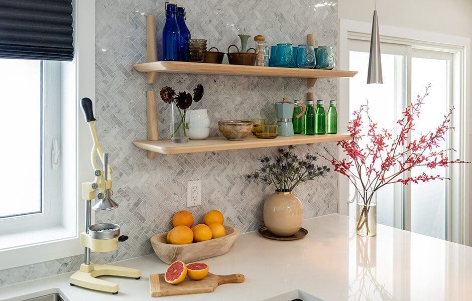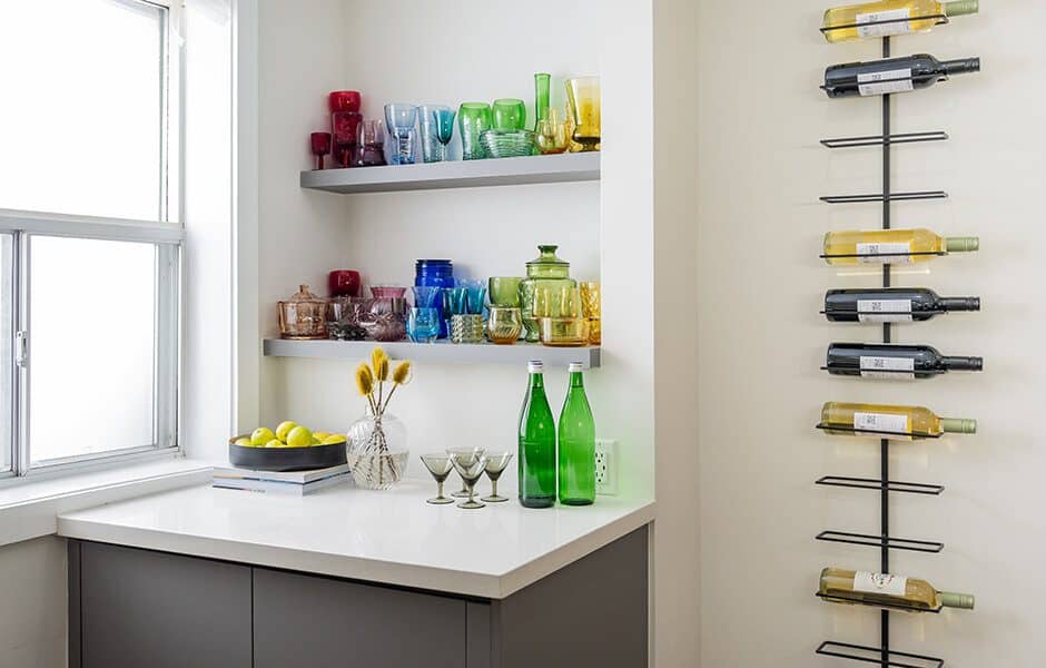 Our total redesign of Paola’s main floor meant working around the header of the basement stairs—not an unusual design issue, but not an easy fix, either. We decided to convert this wasted space into a bar to encourage people to spread out from the kitchen to the living room. We filled it with colorful glasses and stemware to attract the eye, and placed a few extra wine bottles on the wall to entice the thirsty.