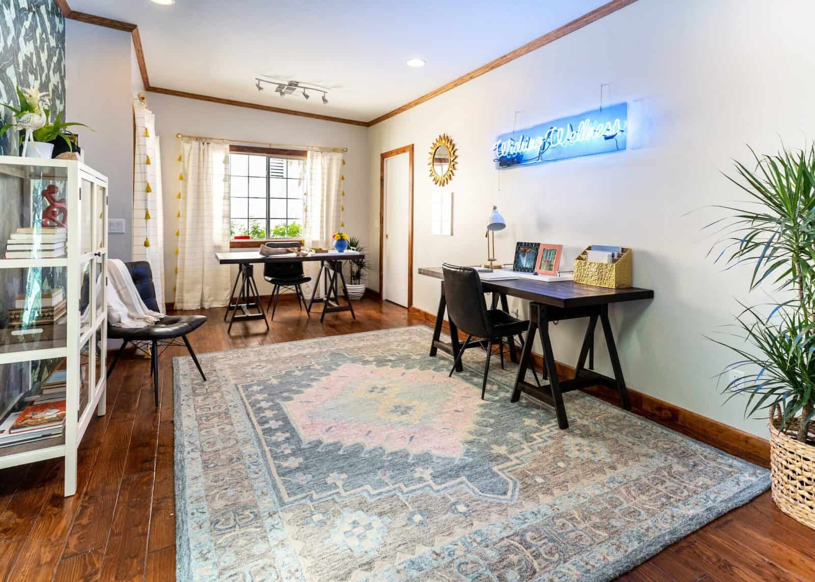 Ren and Scott both work from home, so a quiet office was another must. We took the large open room they had been working out of and created two distinct areas—an office and a mudroom—with a new wall, complete with a barn door. We used a palm leaf wallpaper to make the office feel brighter and more inviting, then added modern furnishings and warm wood accents like two adjustable desks, a teak coffee table, and comfy seating. Now it’s the perfect interruption-free zone for meetings and consultations.