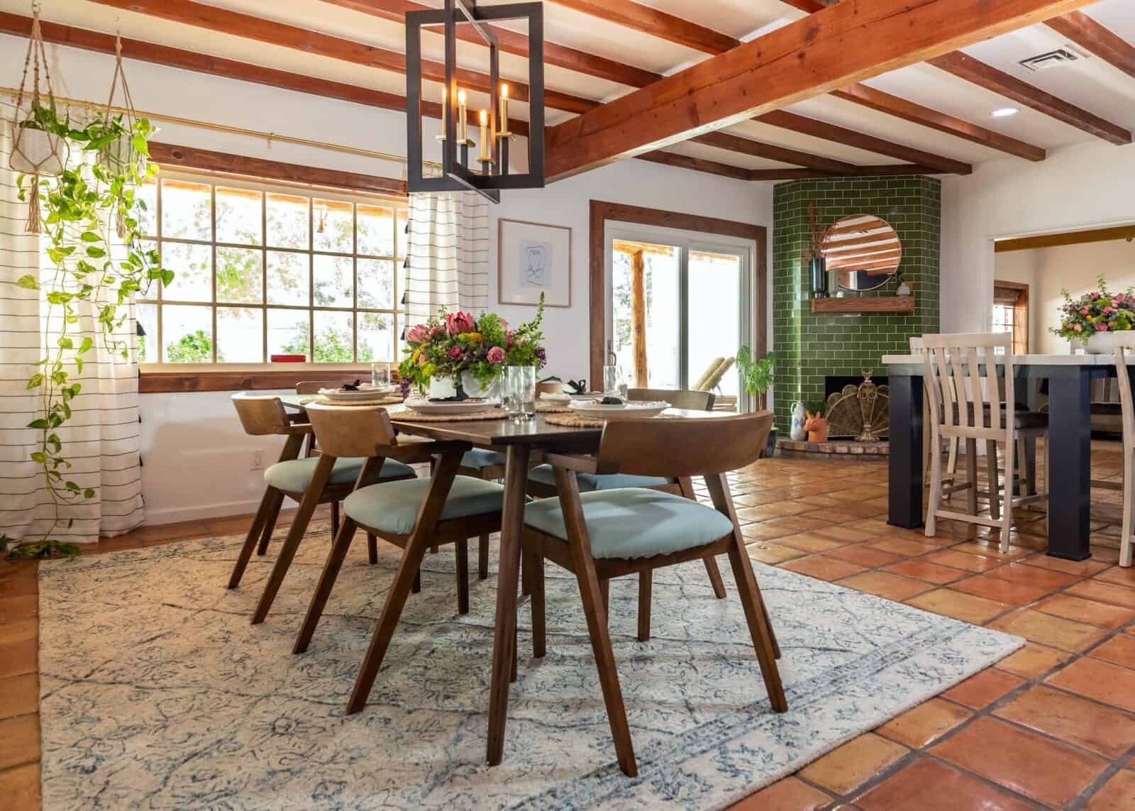 After renovating a string of cookie-cutter-style homes in order to give them more personality, we had a completely different assignment for this vintage Las Vegas home: preserve its quirkiness. Homeowners Ren and Scott wanted to keep the one-of-a-kind features they fell in love with when they moved in, like the terracotta floor tile and exposed beams. But in order to make this their forever home, we needed to fix issues like the lack of ample kitchen seating, the distraction-filled office area, and the uninspiring master bathroom. Add in a revamped dining room fireplace and, over six weeks, we transformed this unique property from slightly problematic to supremely polished.
