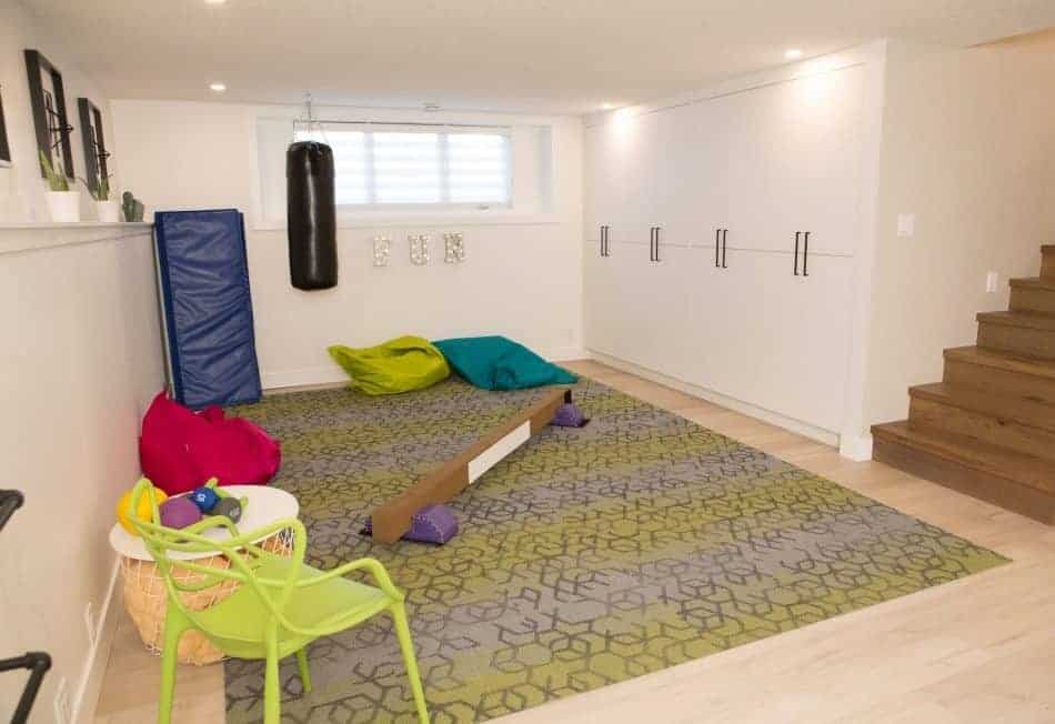 Robin’s finished basement now pulls double duty: Part of it is an open area for the kids to flip, tumble, and jump, and the rest is a colorfully cozy nook for curling up and relaxing. The theme of the entire space is fun, so we introduced lots of bright hues and textures to make it visually appealing. And we totally screamed for this delicious ice cream wallpaper from Rebel Walls—it’s the cherry on top of this playroom, if you will.