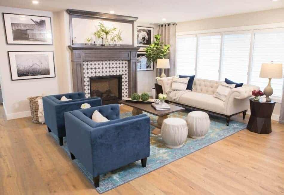 After centering the living room fireplace, we centered our focus on appeasing Robin’s love of both rustic and classic design elements. We carefully selected a glazed porcelain tile with a modern farmhouse feel and used dark grout to add contrast and tie it together with the traditional mantel design. Originally, the surround and mantel were supposed to be off-white, but they accidentally got stained a dark color. Luckily, Robin ended up falling in love with it—so it stayed!