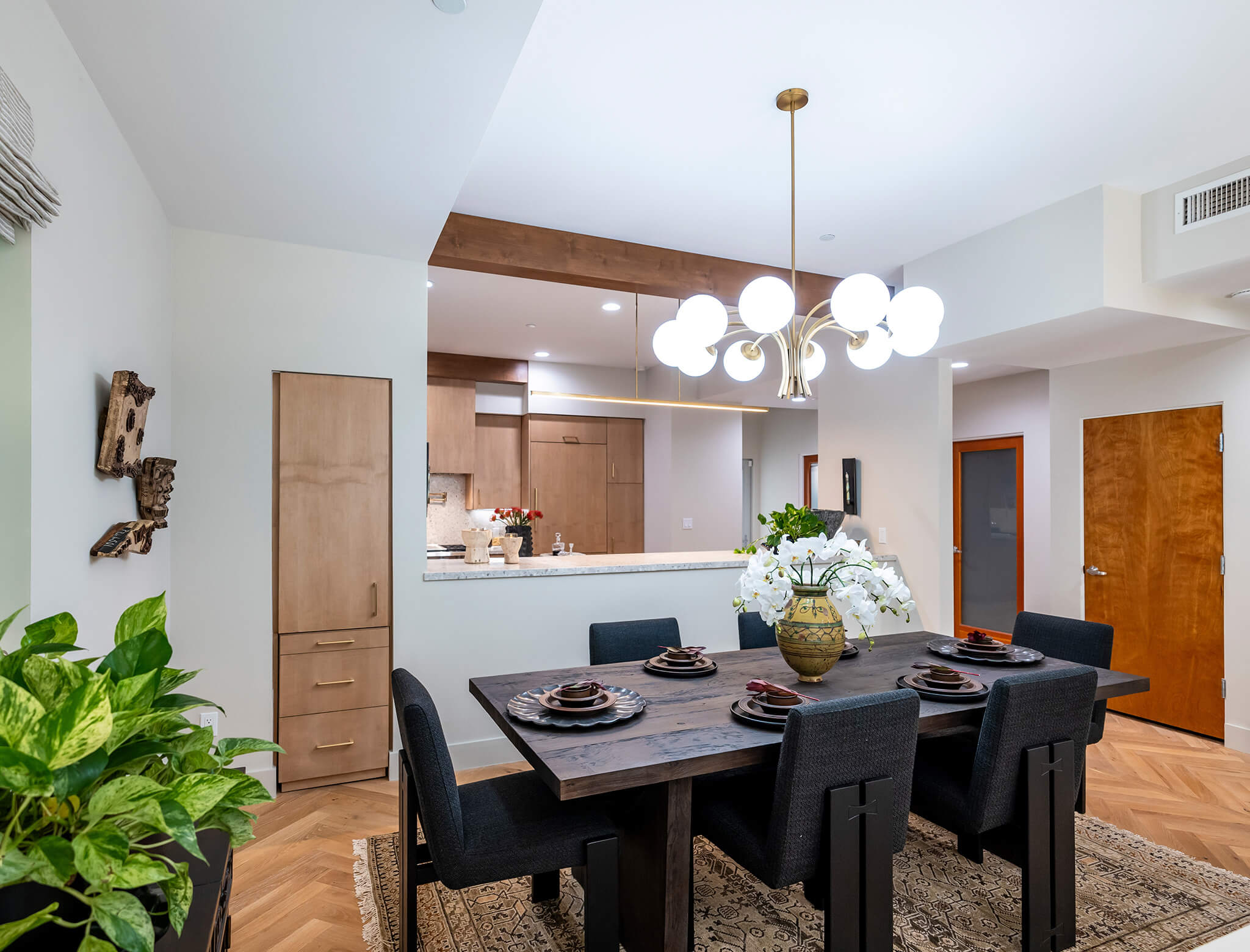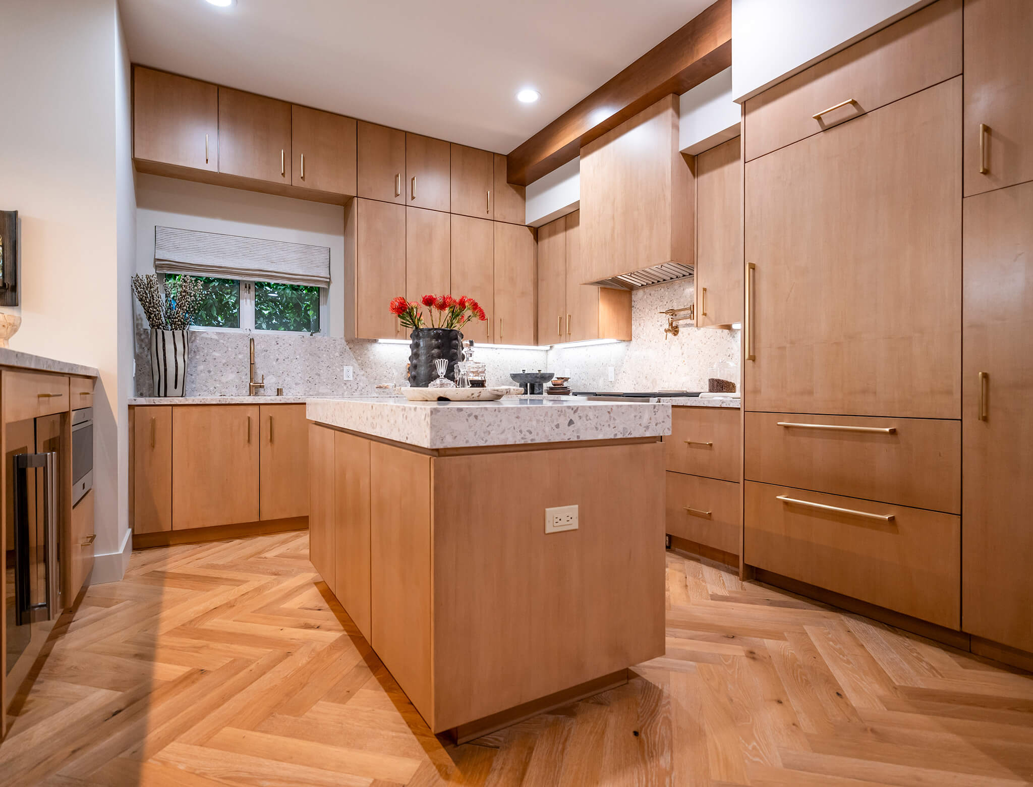 The herringbone pattern on the wood floor is a seemingly small detail that makes a huge impact on the overall design. It adds that touch of sophisticated style in a subtle, thoughtful way.
