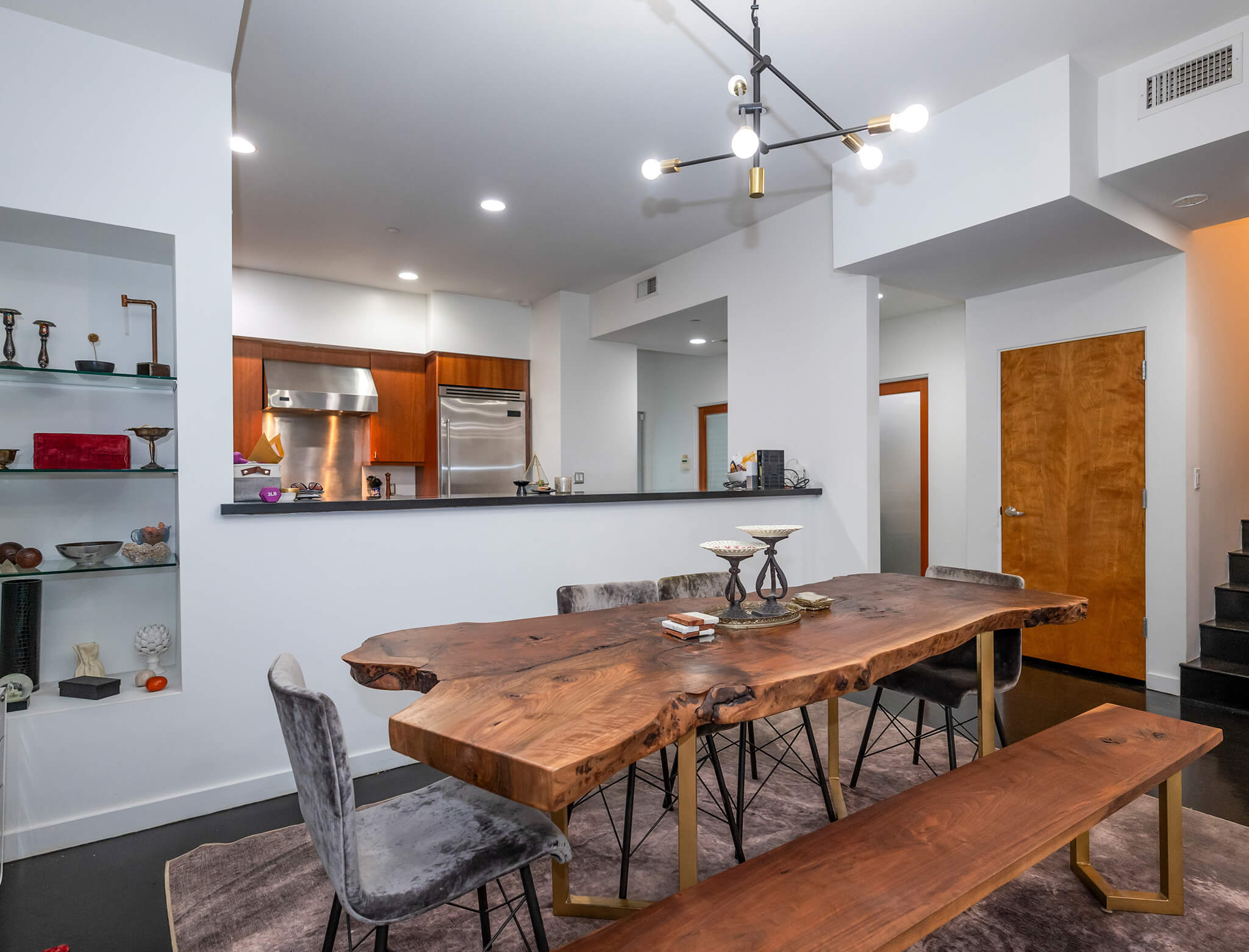 The bold, black dining table is the star of the show in this room, making a visual impact that still feels cohesive with the design style. The hidden dry bar behind the wood door is a subtle, chic way to keep Amy’s bar gear handy without creating visual clutter.