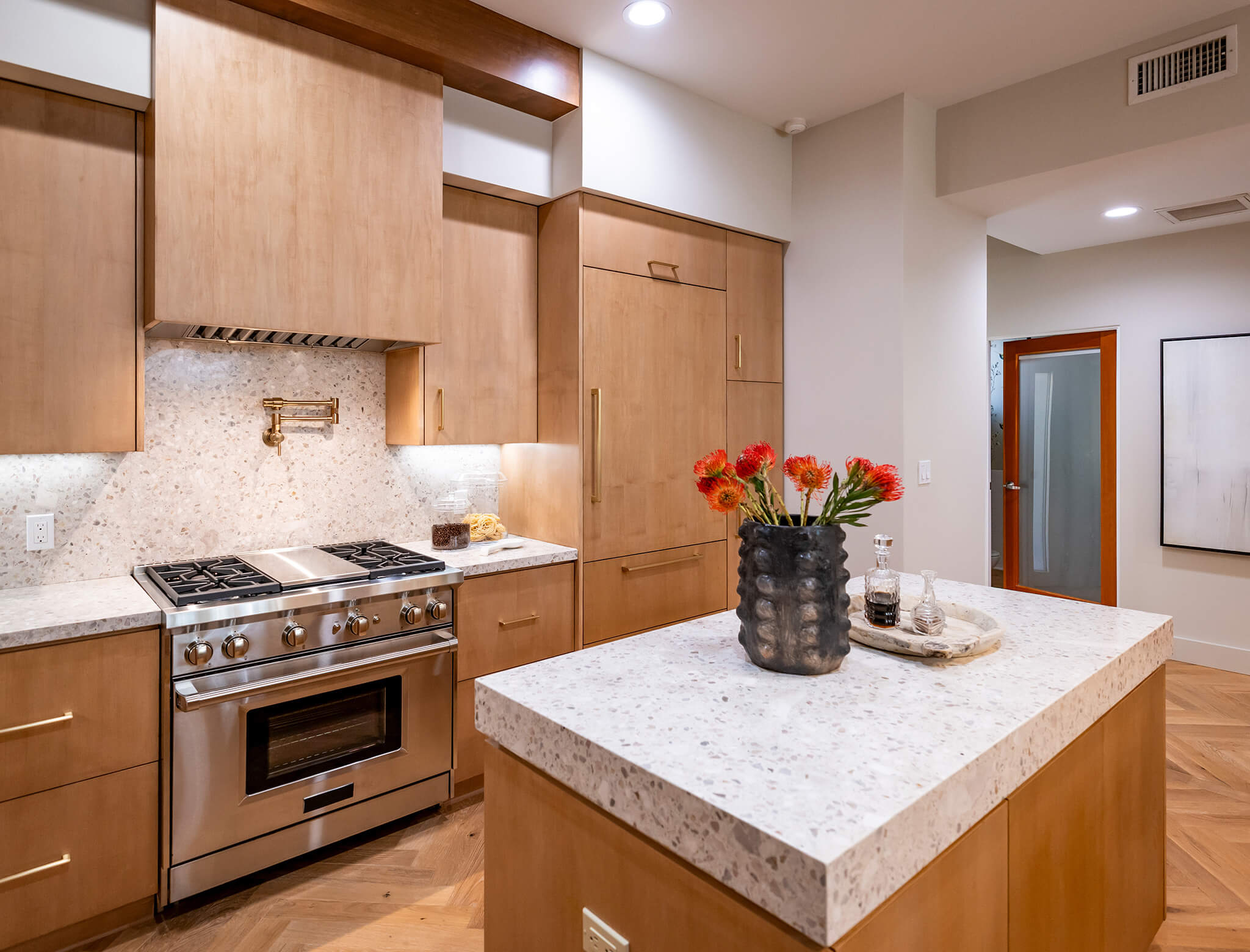 Of course, making the space brighter and lighter was something that was very important to Sarah. Amy loves the look of that natural, mid-century modern aesthetic, and Sarah and the Bros wanted to make sure to incorporate those elements. The light-toned wood was a fabulous way to do this, and the upgraded paneled appliances take the design to the next level.