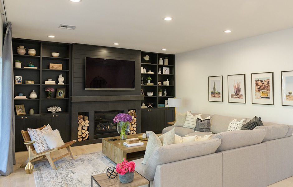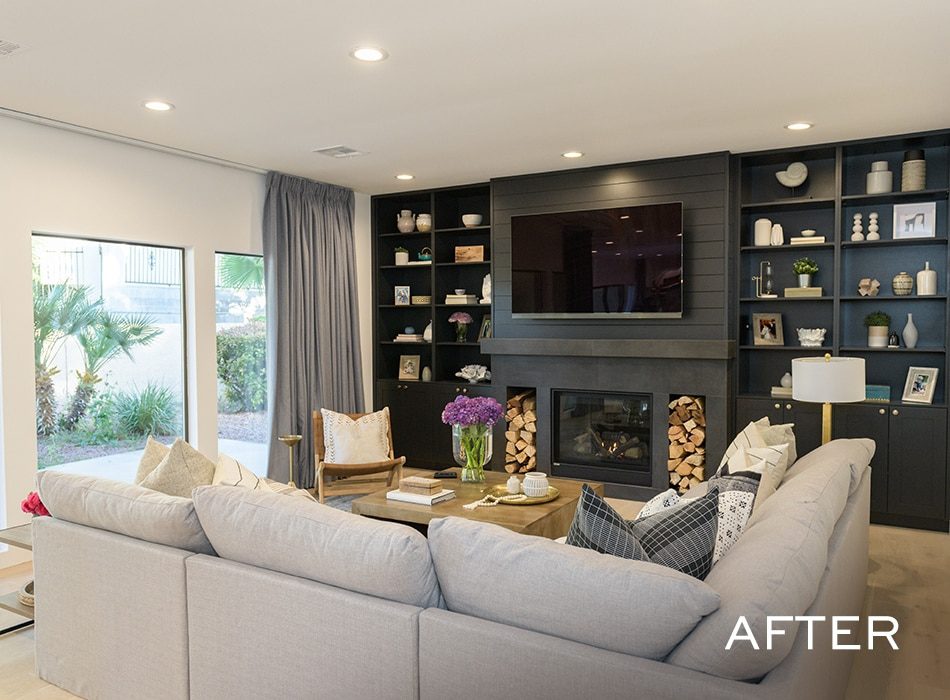 Shaly taught us a new word during this episode: ‘foofy,’ which she explains is “A Miami-Cuban word for super fancy.” Our goal was to make their new home a little foofy without overdoing it, and this fireplace feature wall does just that. We knocked out the old, outdated fireplace rock and replaced it with this more modern and elevated look. The surrounding custom built-ins offer plenty of storage, while black shiplap above the charcoal tile mantle keeps things elegant.