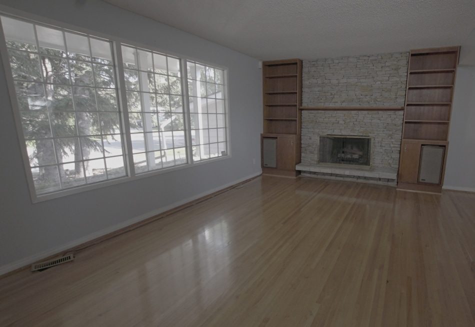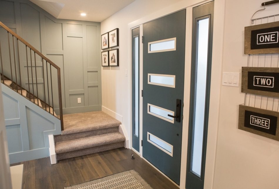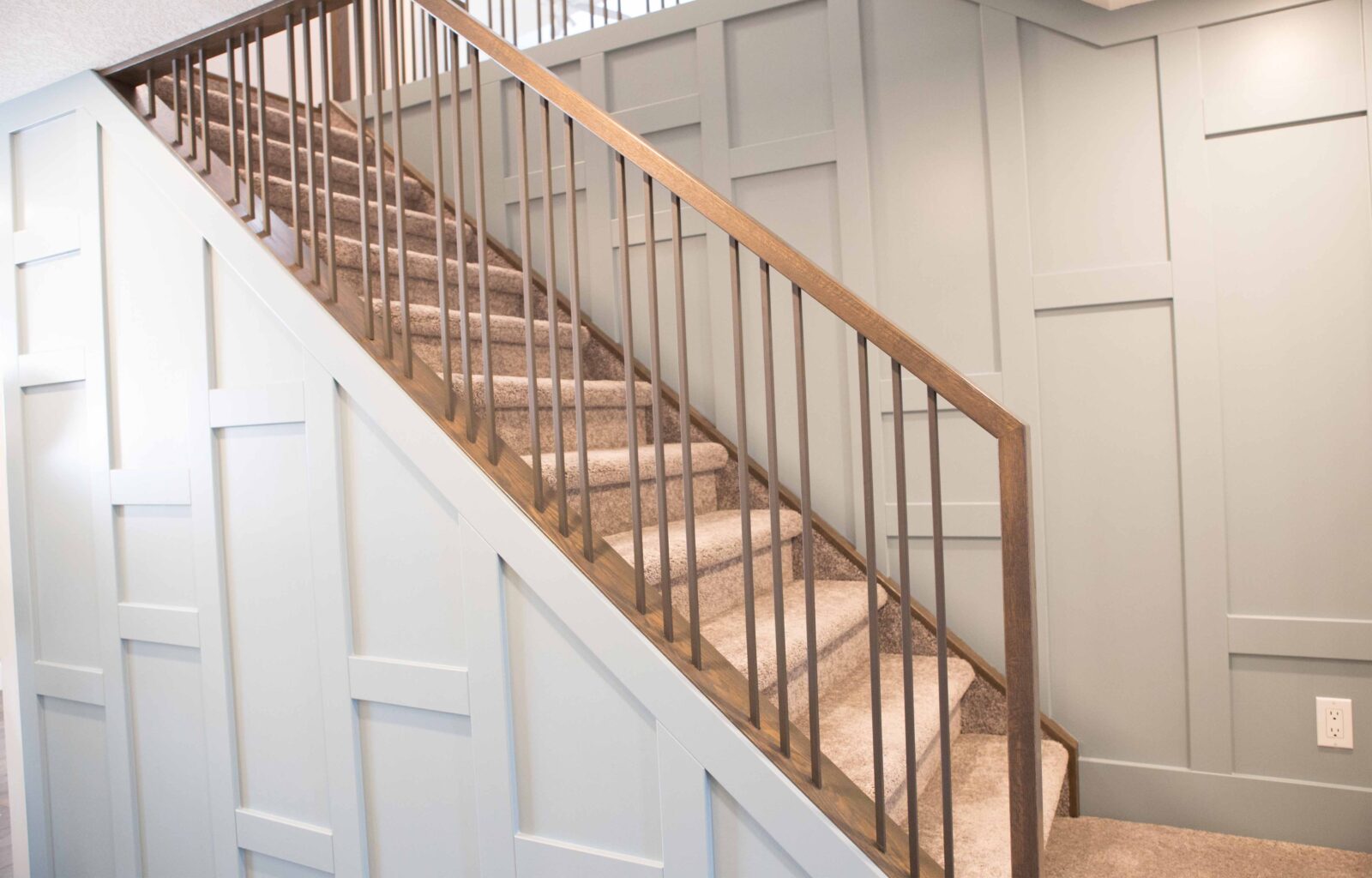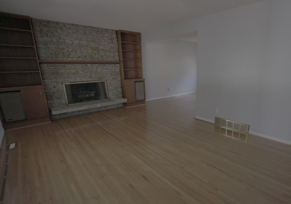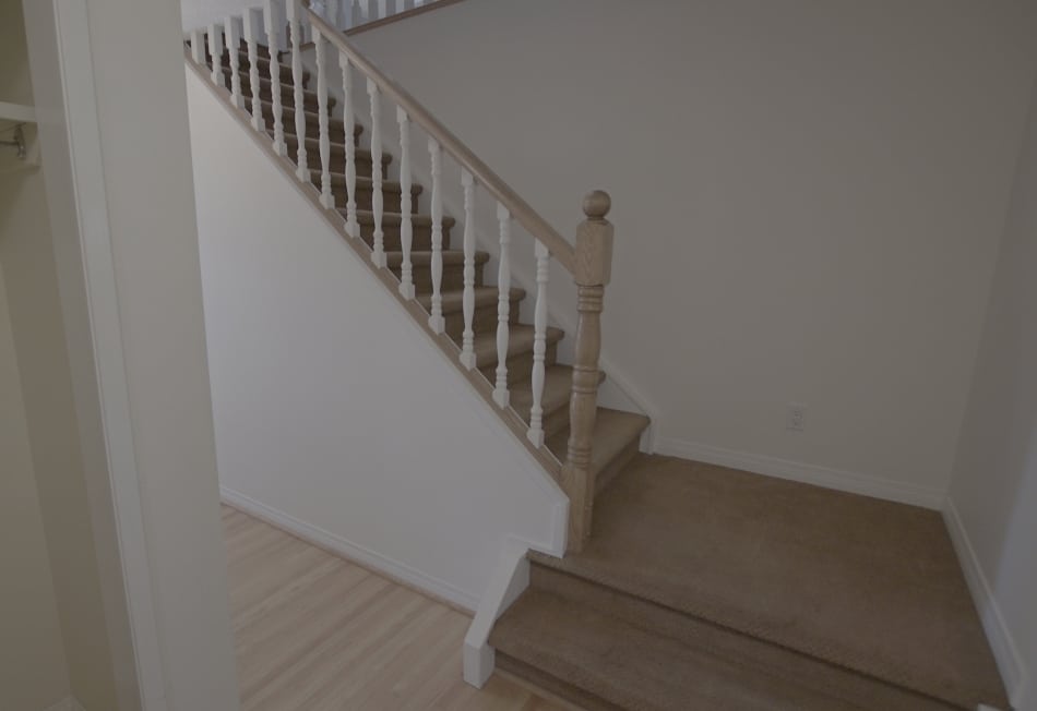 Due to some shifts in the budget, we couldn’t give the entryway the extreme makeover we had originally intended—but it still looks super sharp. After replacing the potentially decades-old carpet, we added depth with moulding and accent paint on the built-ins and stairwell walls. We also replaced the railing with new metal spindles and a banister to match the hardwood—this combination gives the entrance a rustic-meets-midcentury modern touch.
